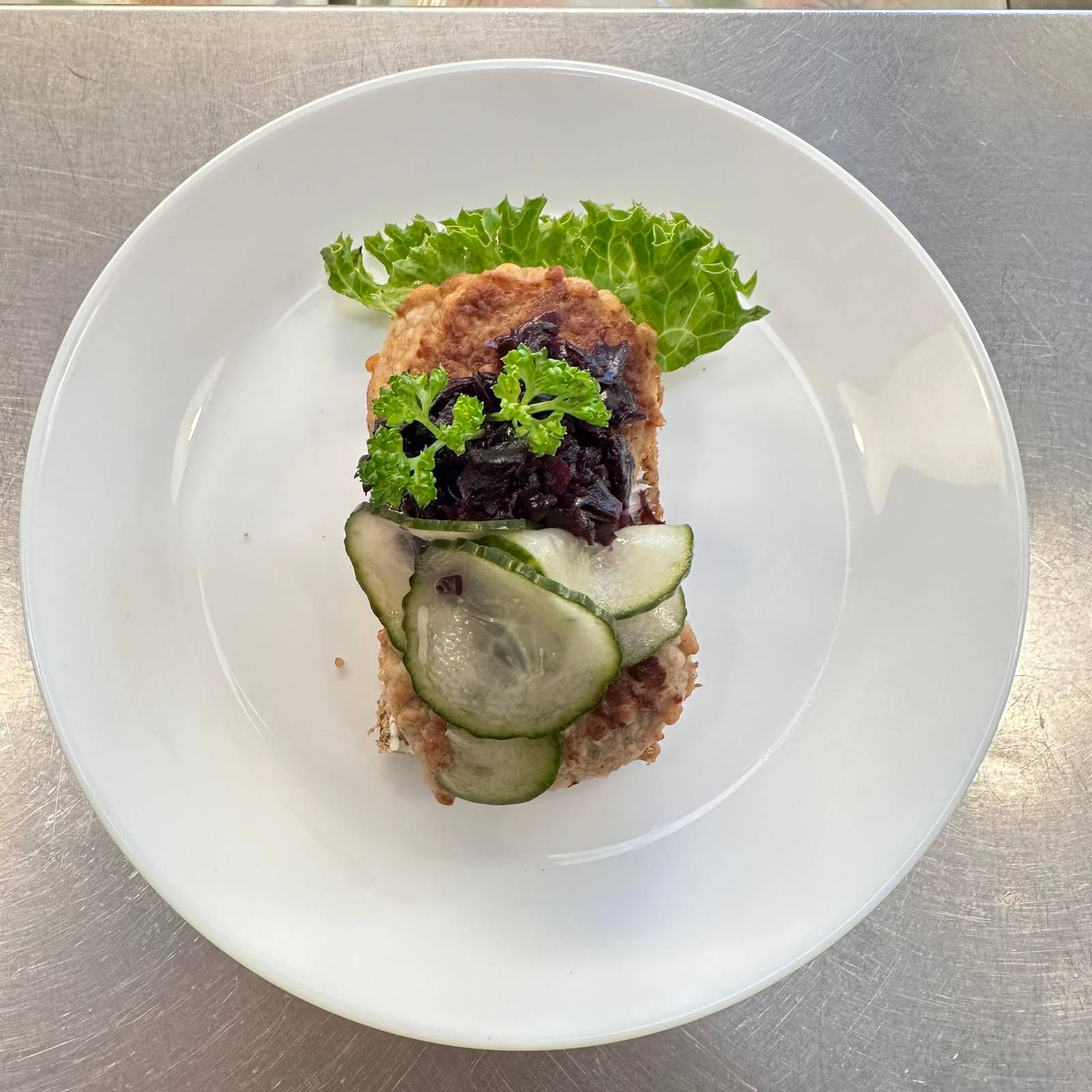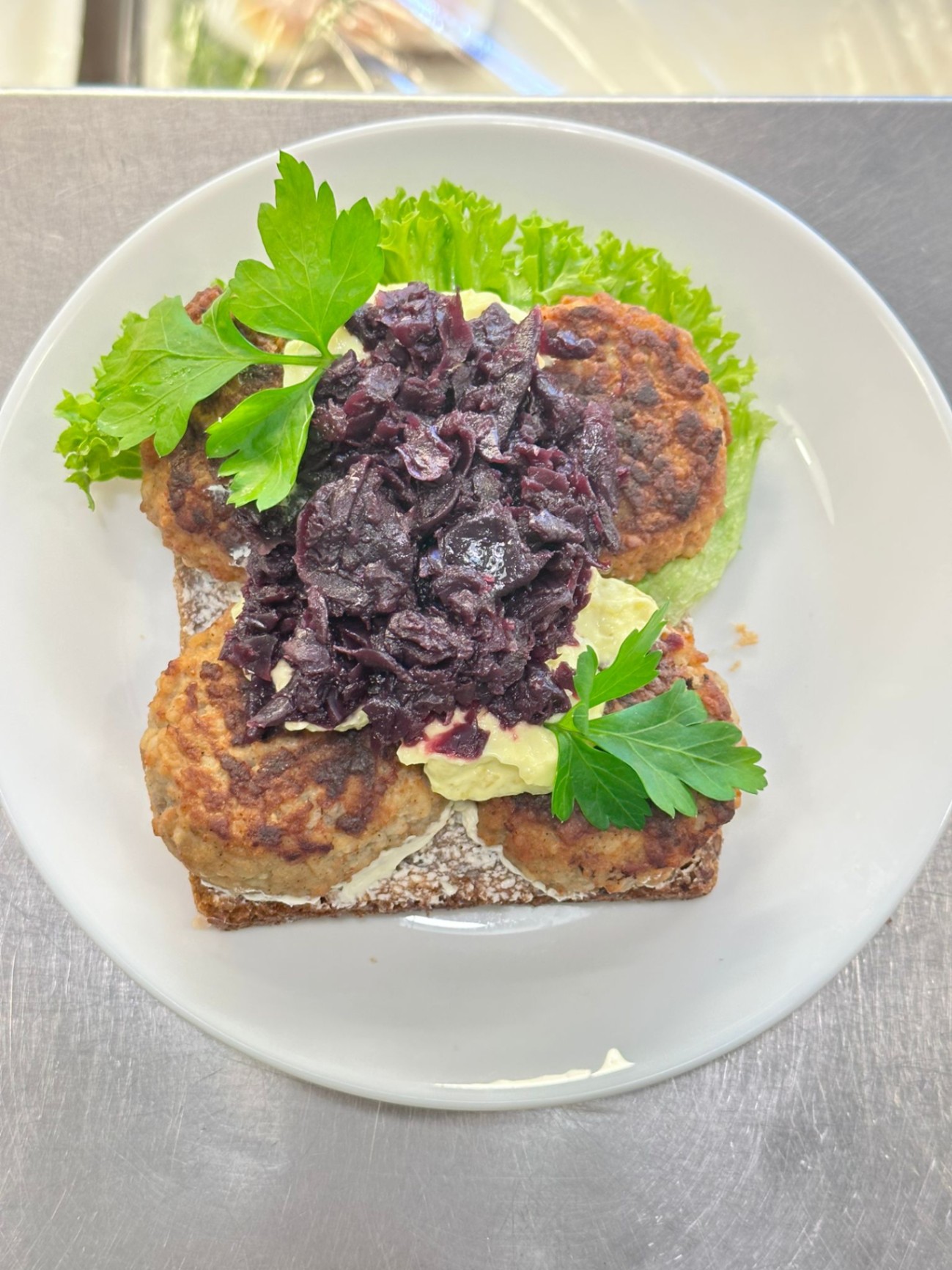 Traditionella frikadeller på en bädd av mörkt rågbröd, serverade med klassisk dansk rödkål och krispig inlagd gurka. En tidlös favorit som alltid uppskattas. Meddela allergier vid beställning.