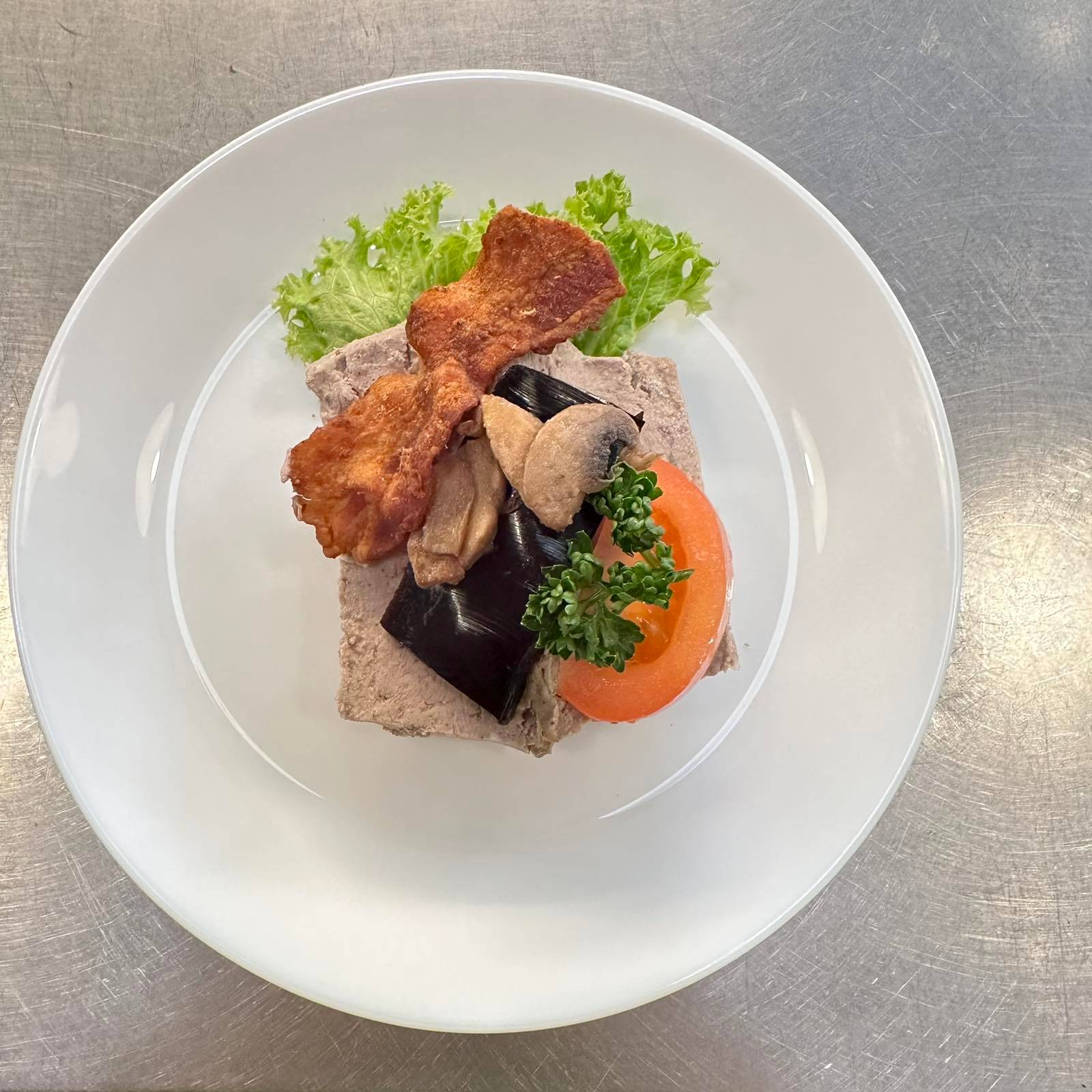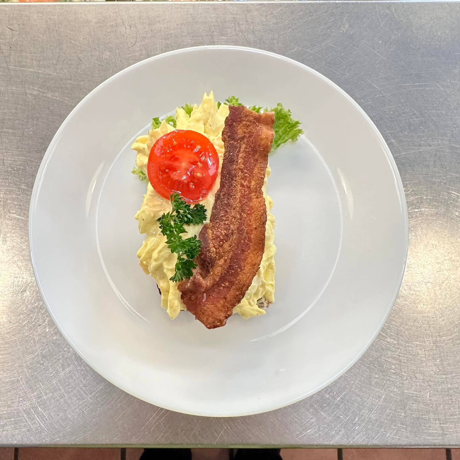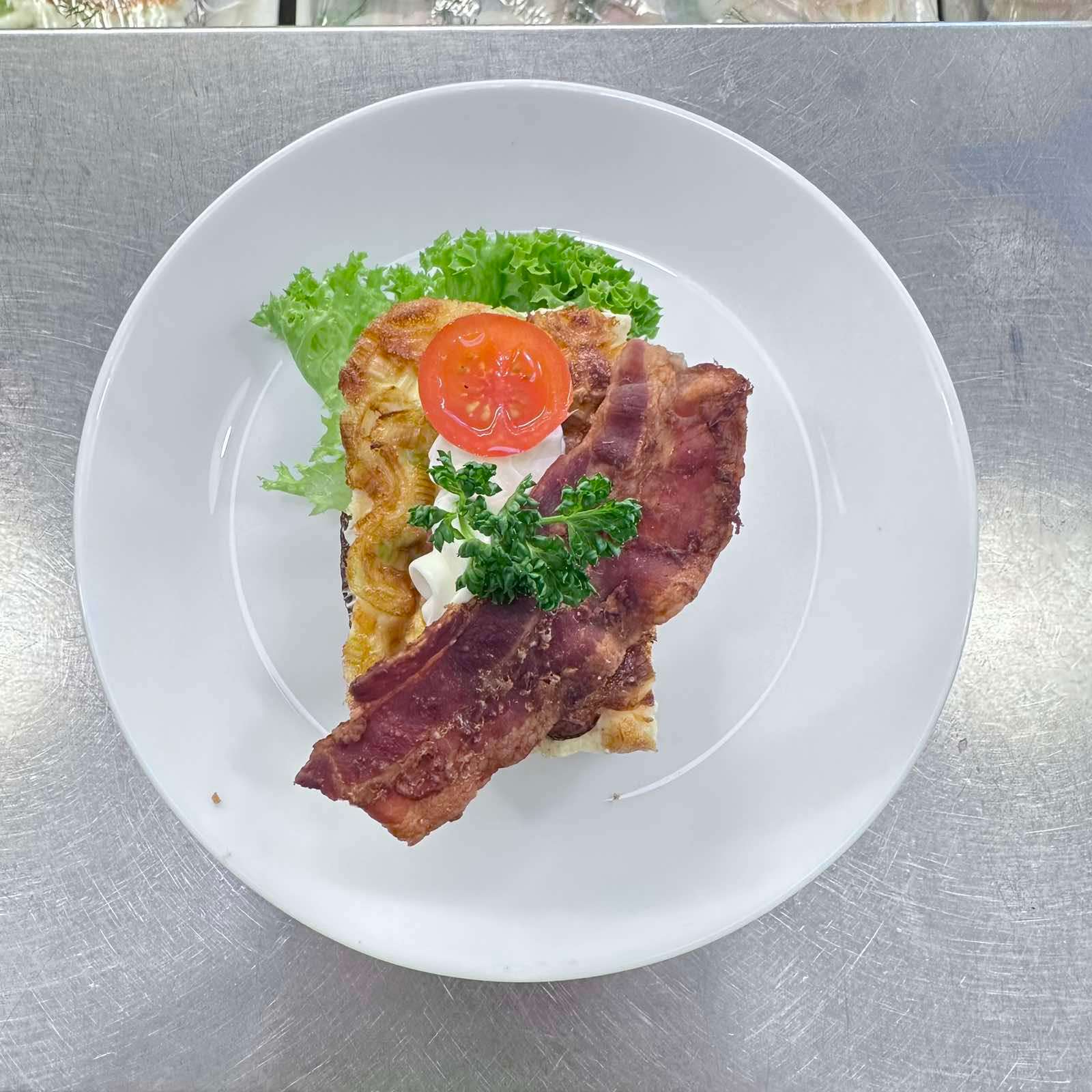 En matig dansk klassiker på mörkt rågbröd, toppad med krämig äggakaka, knaperstekt bacon och färsk purjolök. Garneras med tomat och persilja för en komplett smakupplevelse. Meddela allergier vid beställning.