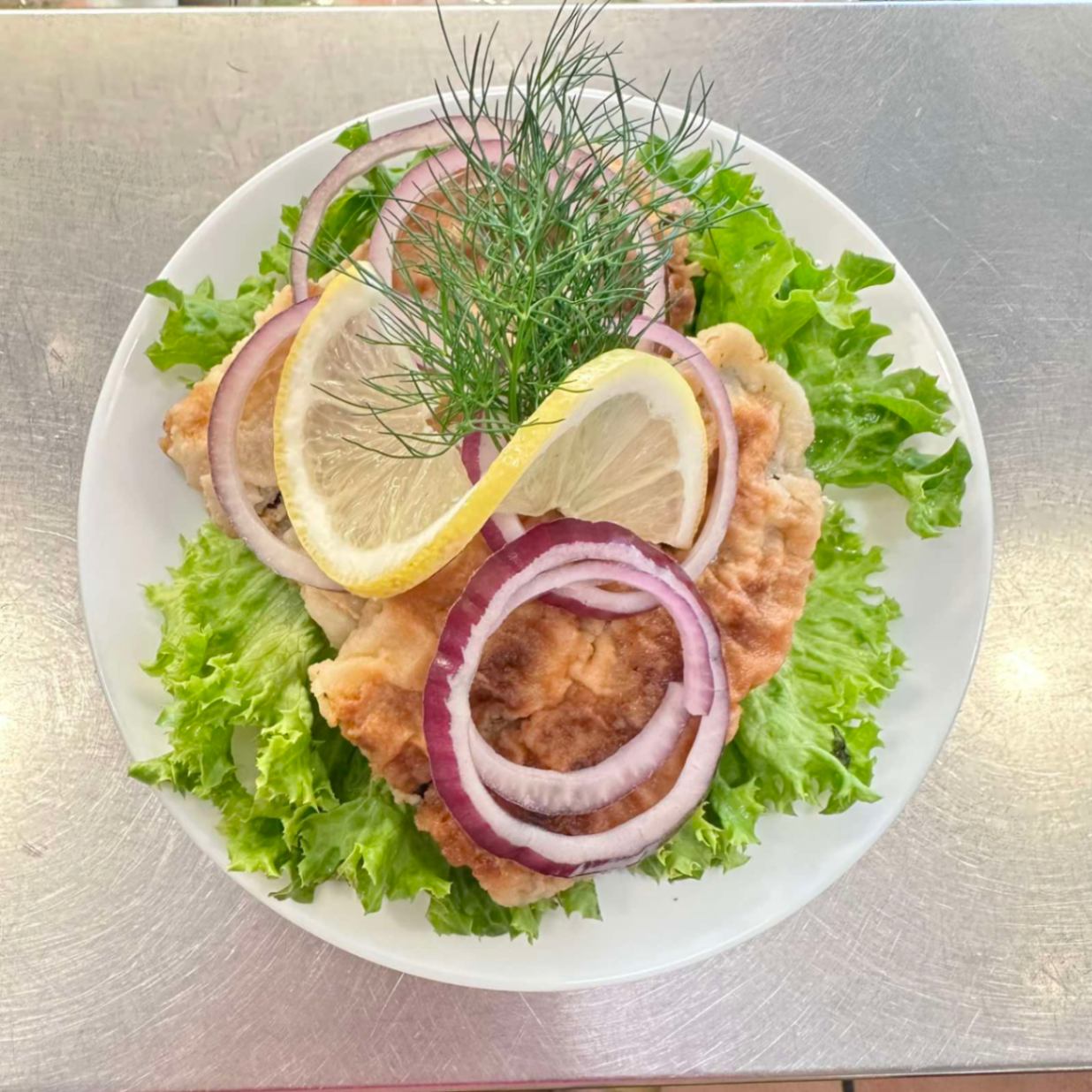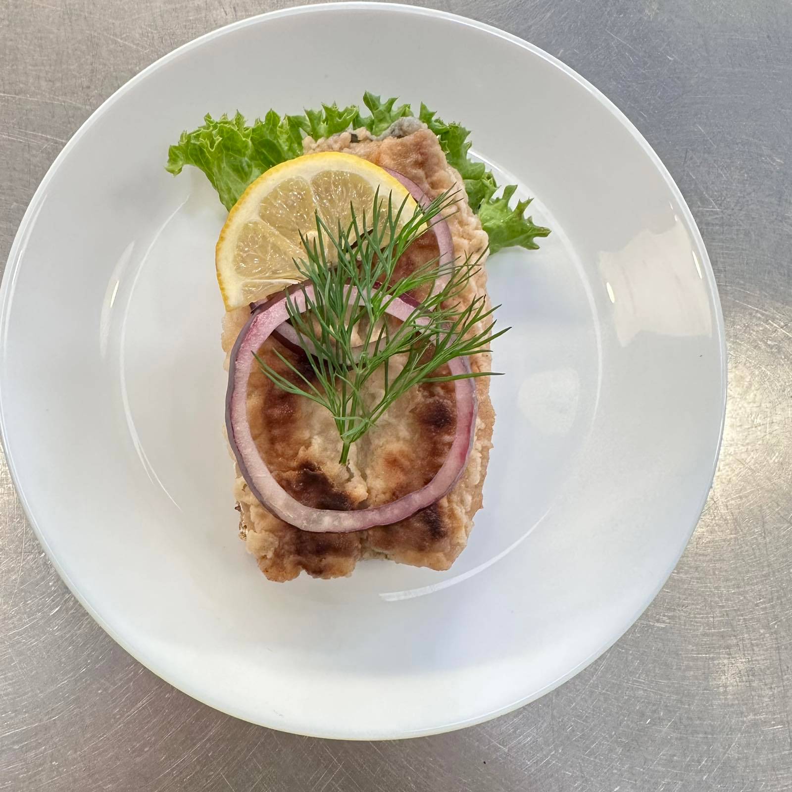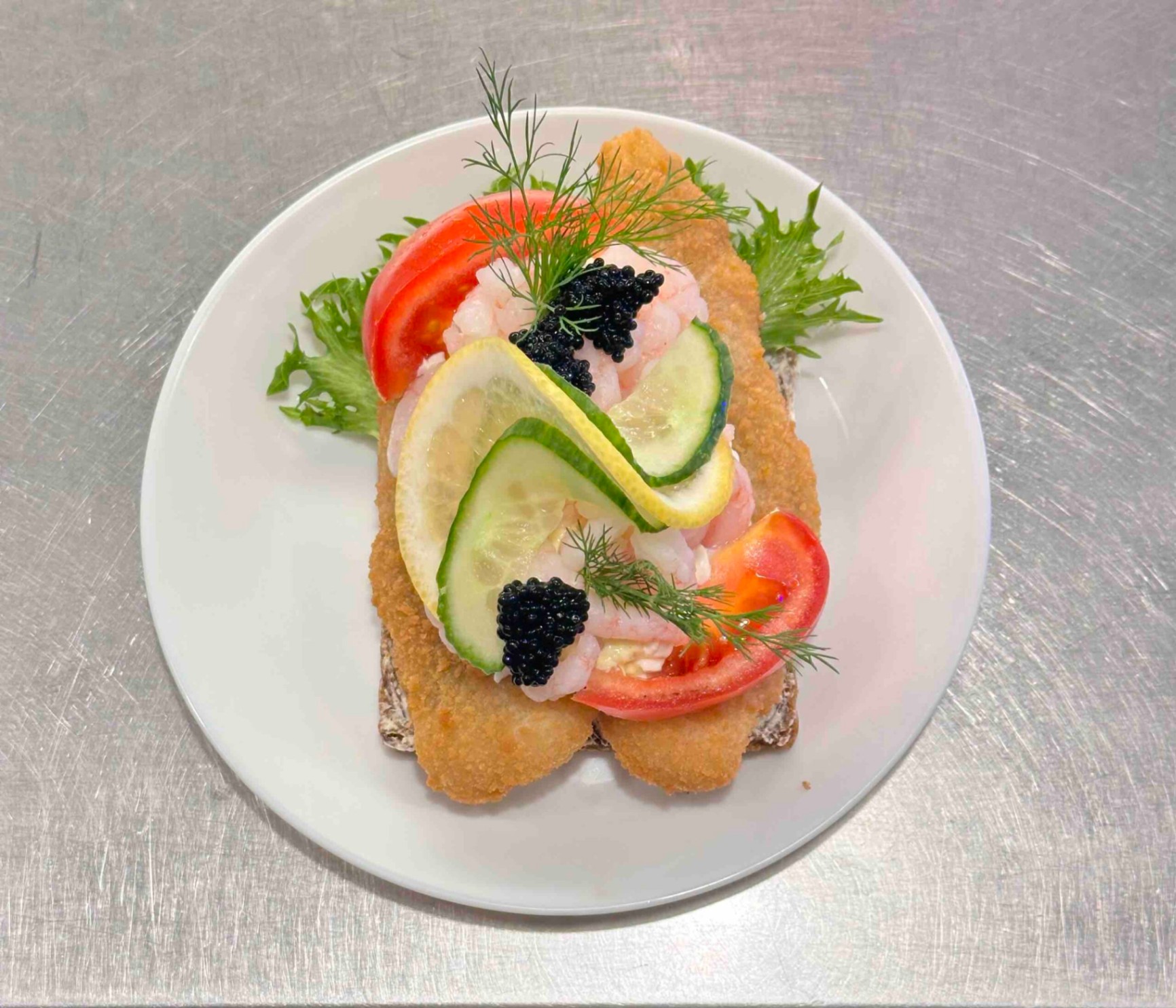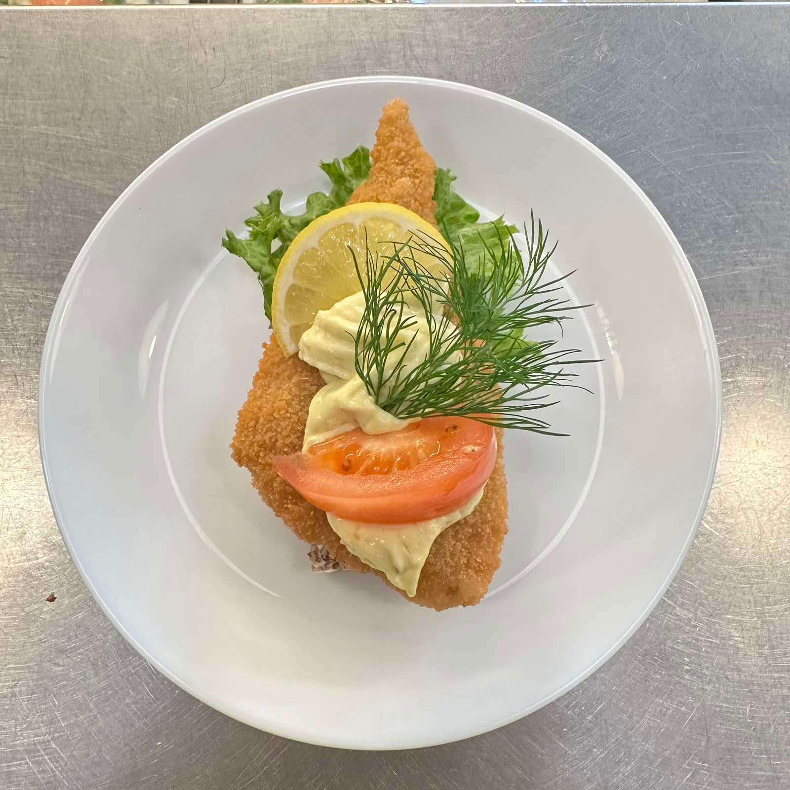 Klassisk stor håndmad på mörkt surdegsbröd med fullkorn och linfrö. Serveras med en krispig fiskfilé på en bädd av fräsch sallad, toppad med dansk remoulad, citron, tomat och färsk dill. Kan anpassas efter önskemål; meddela allergier vid beställning.