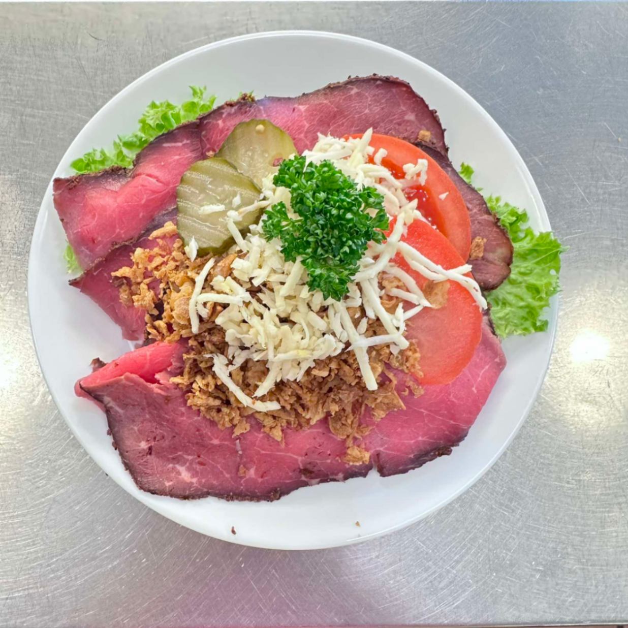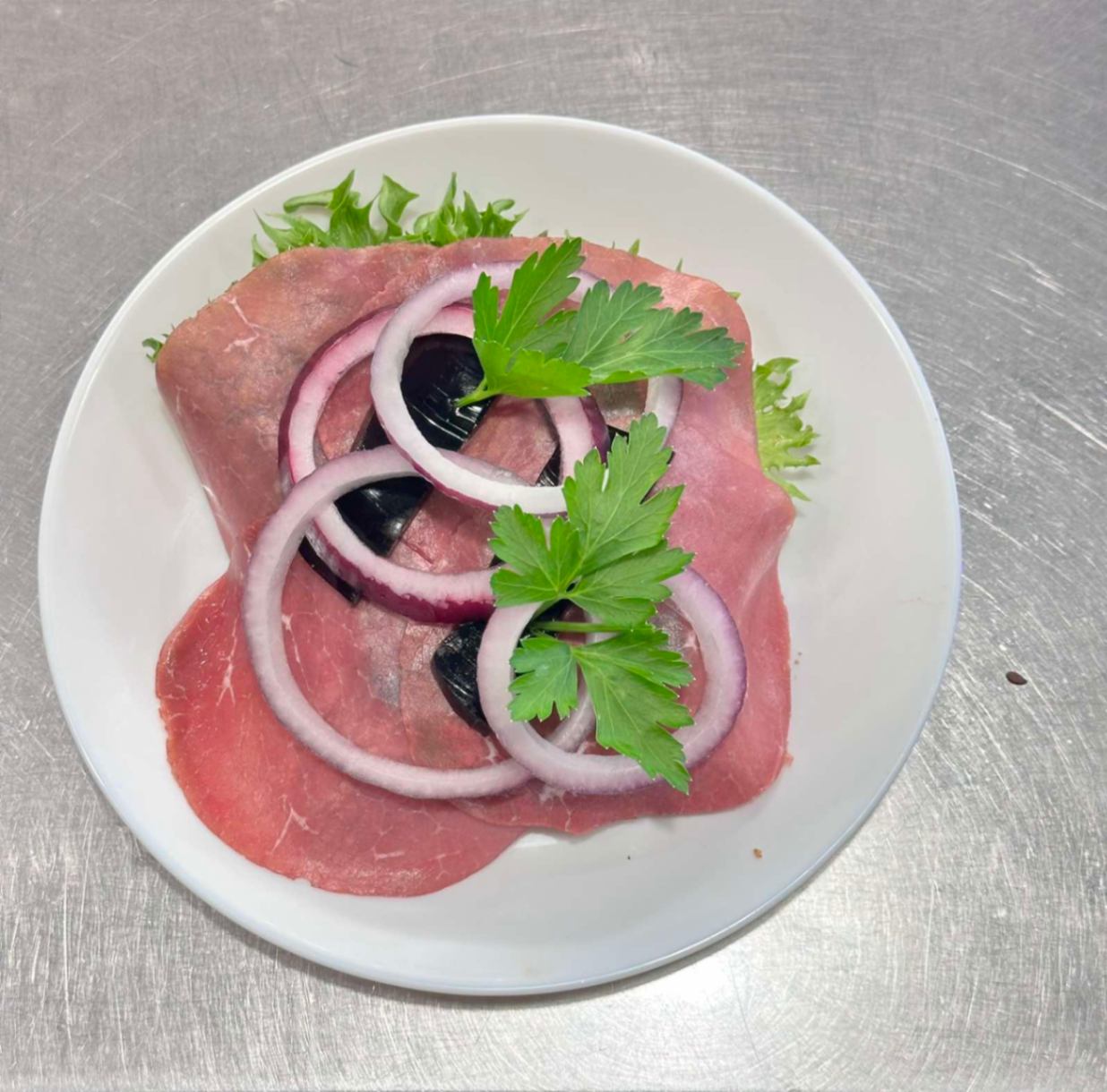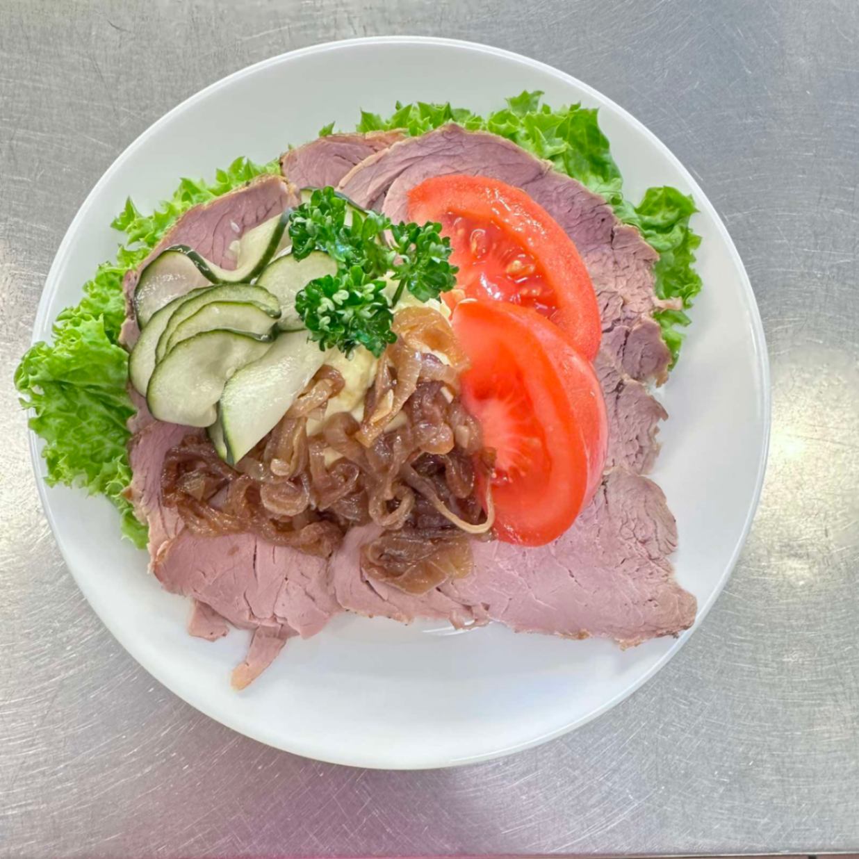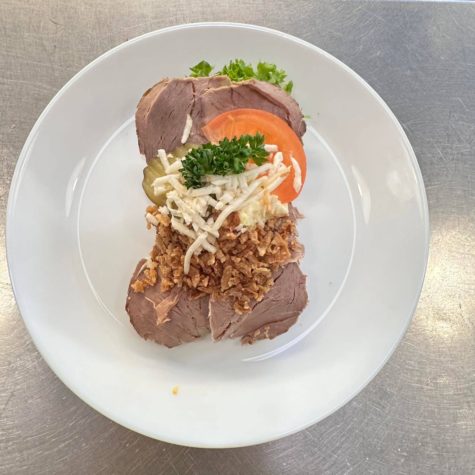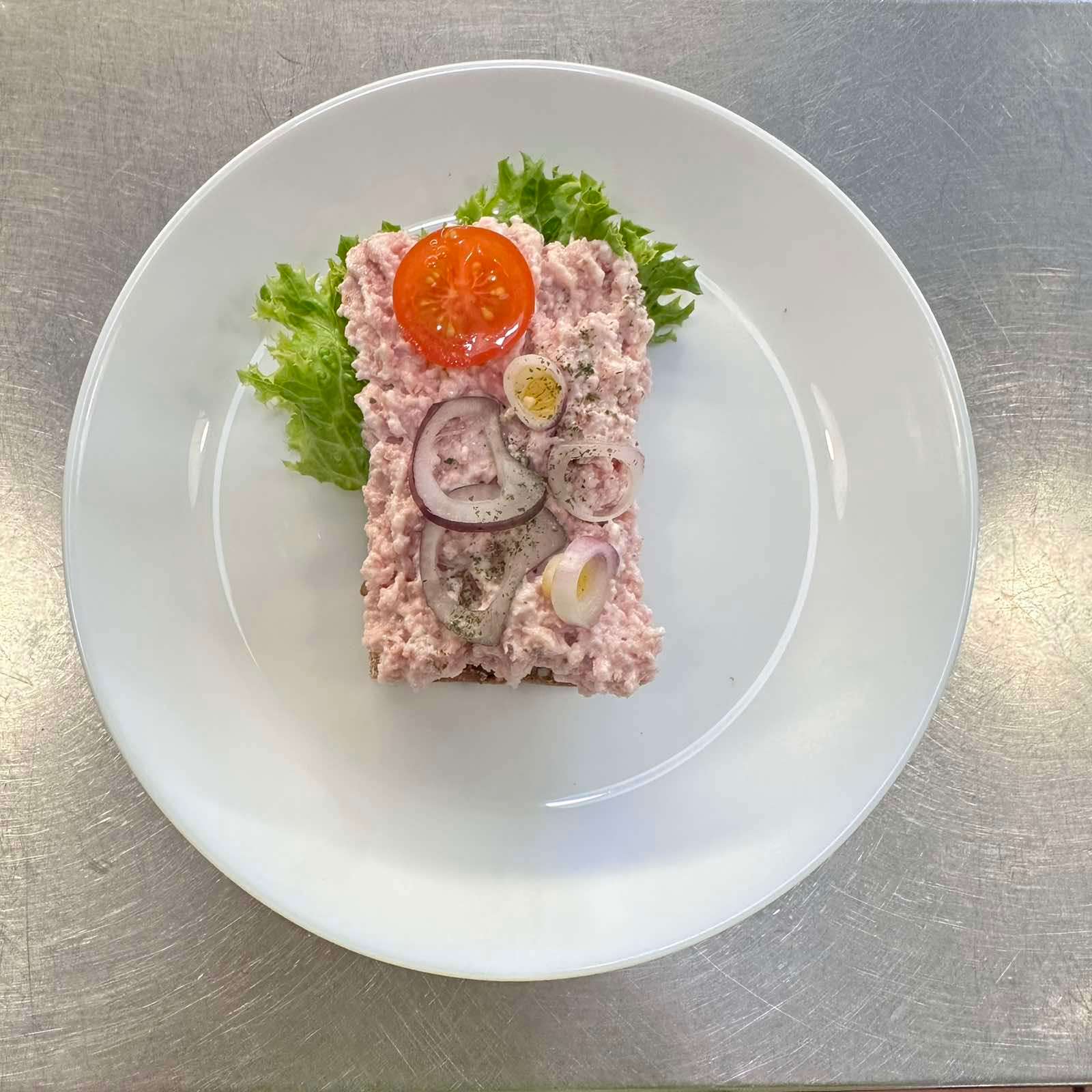 En av Danmarks mest kända klassiker! Mörkt rågbröd med leverpastej, saltkött, smakrik sky och färska rålöksringar. En genuin och fyllig smakupplevelse för den som vill ha det riktigt traditionellt. Meddela allergier vid beställning.