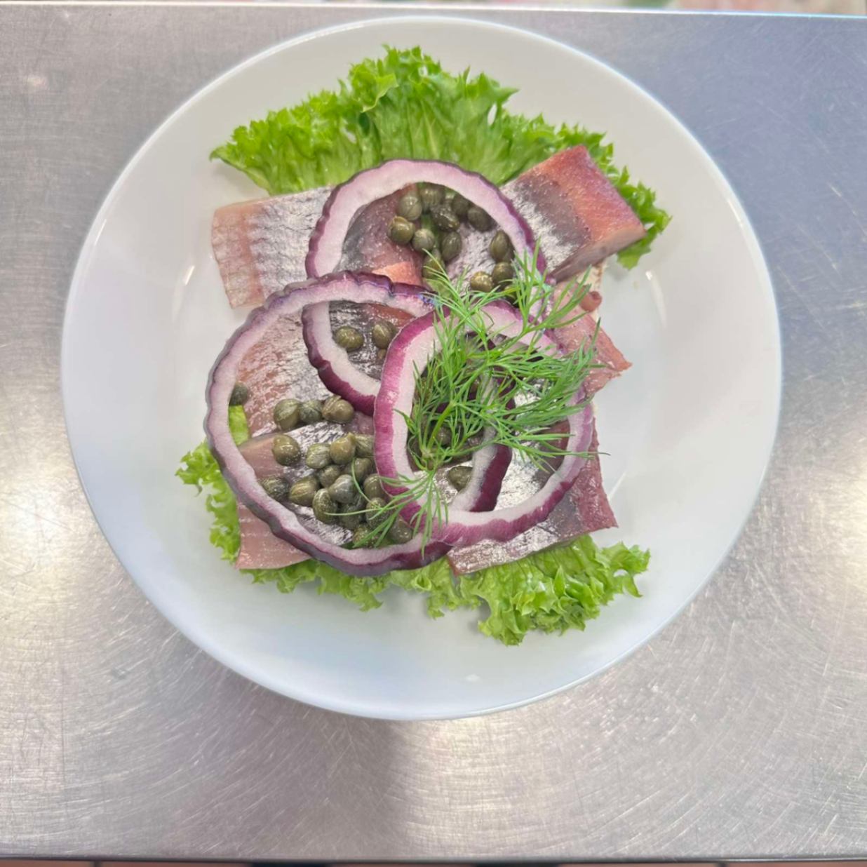 Klassisk håndmad på mörkt surdegsbröd med fullkorn och linfrö. Serveras med smakrik löksill på en bädd av krispig sallad, toppad med rödlök, kapris och dill.