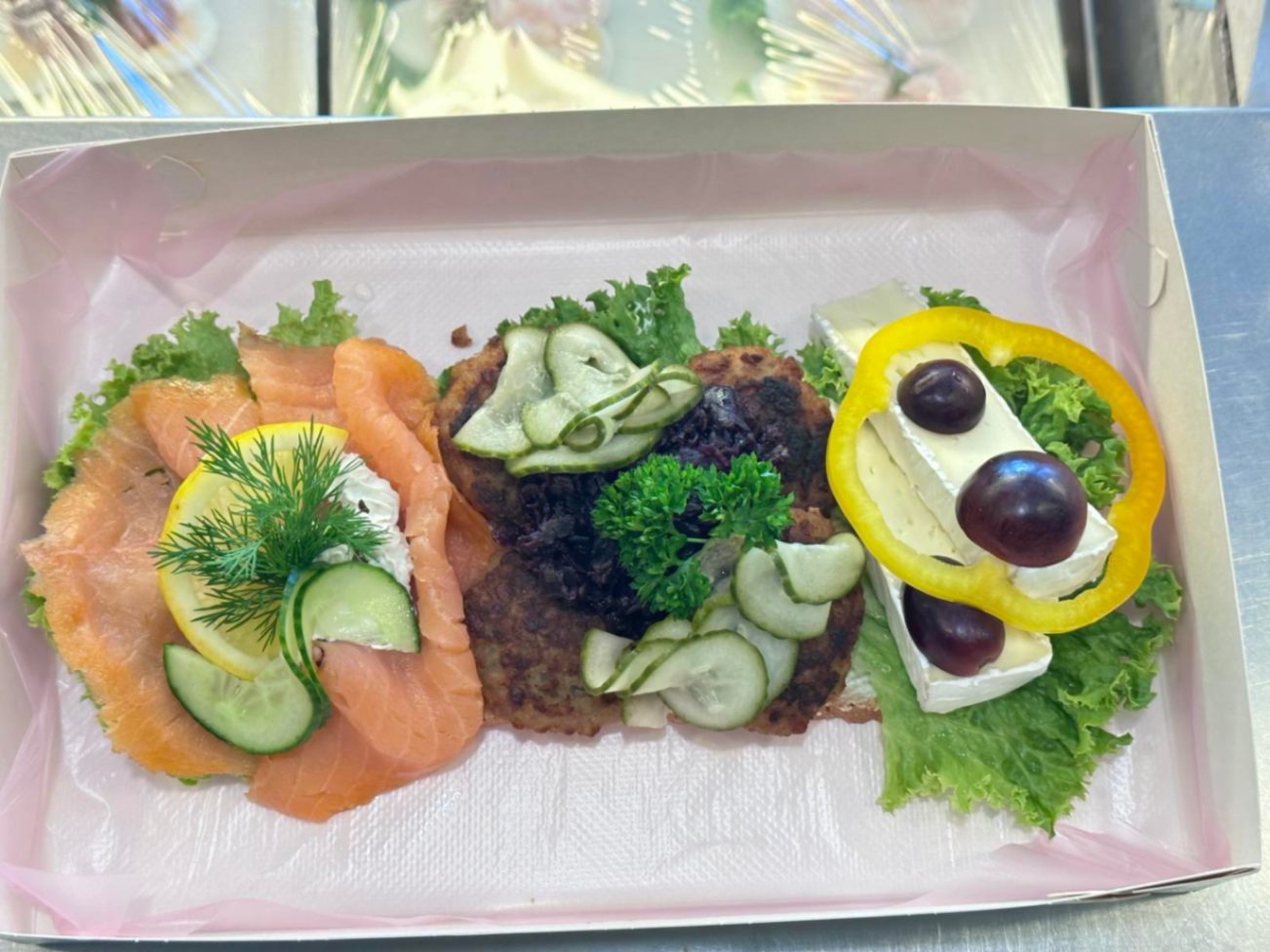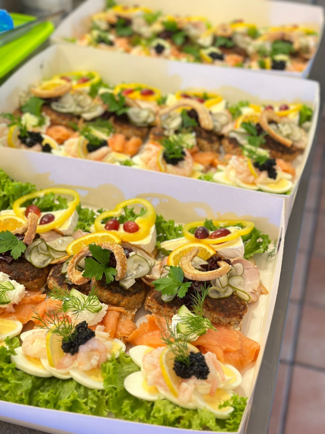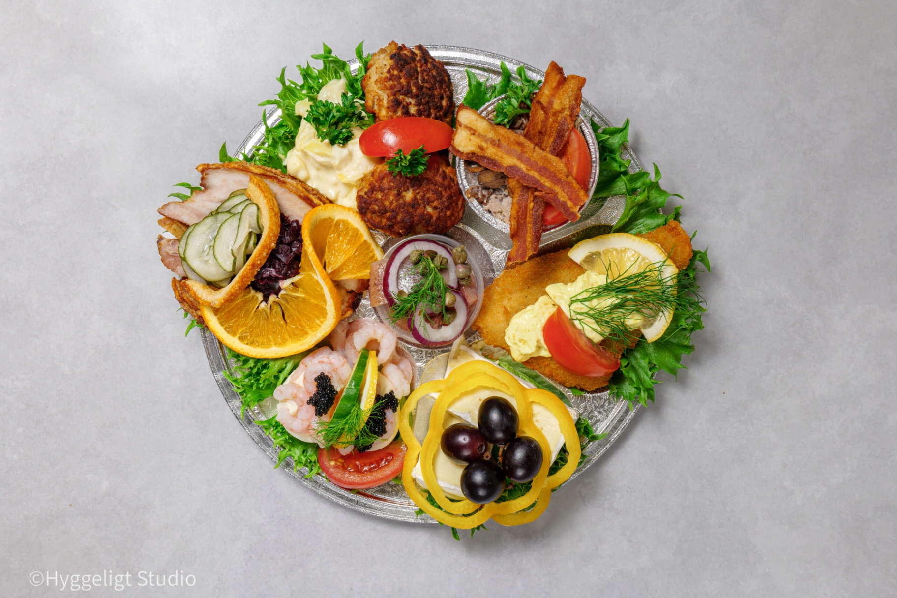 Matig landgång med ägg och räkor, smakrik hakkebiff med bearnaise och lökring, samt dansk ribbensteg med inlagd gurka och rödkål. Toppas med brieost, vindruvor och paprika. Kan anpassas efter önskemål; meddela allergier vid beställning.