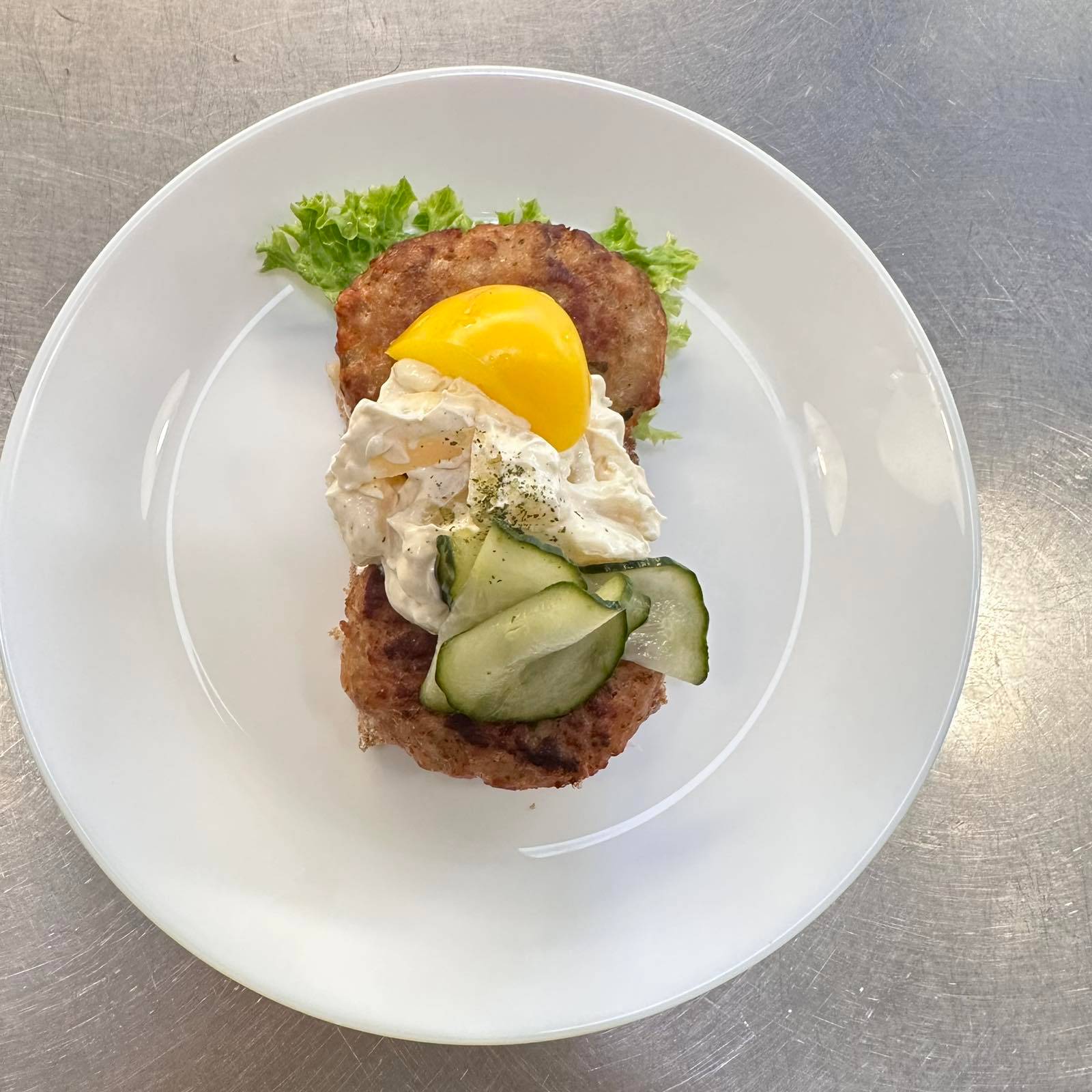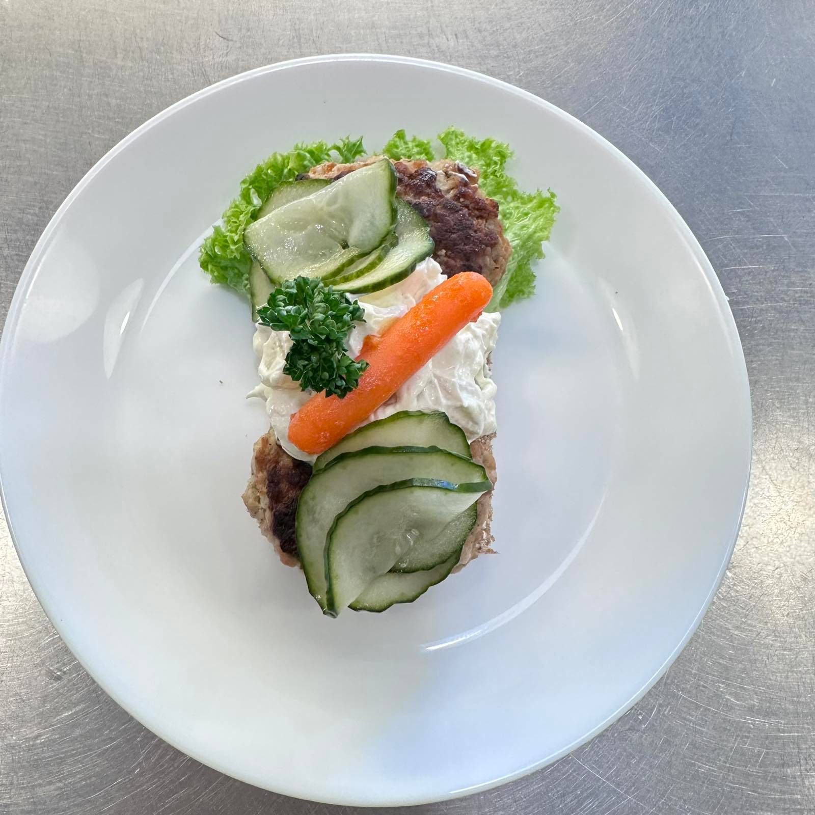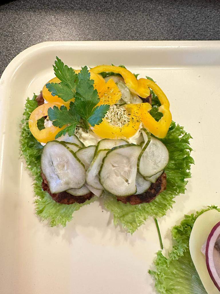 Klassiska danska frikadeller som serveras på mörkt rågbröd tillsammans med krämig hemgjord potatissallad. Toppas med inlagd gurka, paprika och persillade för en komplett smakupplevelse. Meddela allergier vid beställning.
