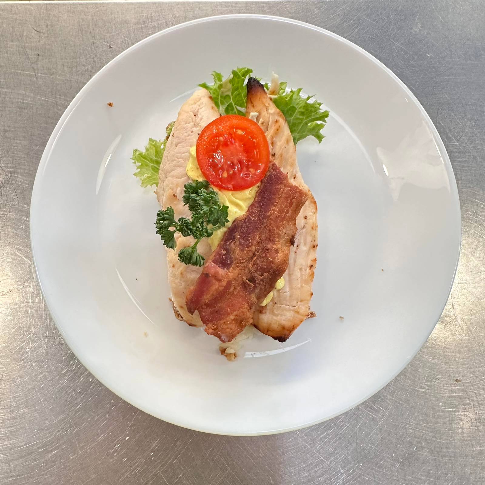 Saftig grillad kyckling på mörkt rågbröd, kombinerad med en smakrik currymajonnäs och knaperstekt bacon. En matig och populär favorit med mycket smak. Meddela allergier vid beställning.