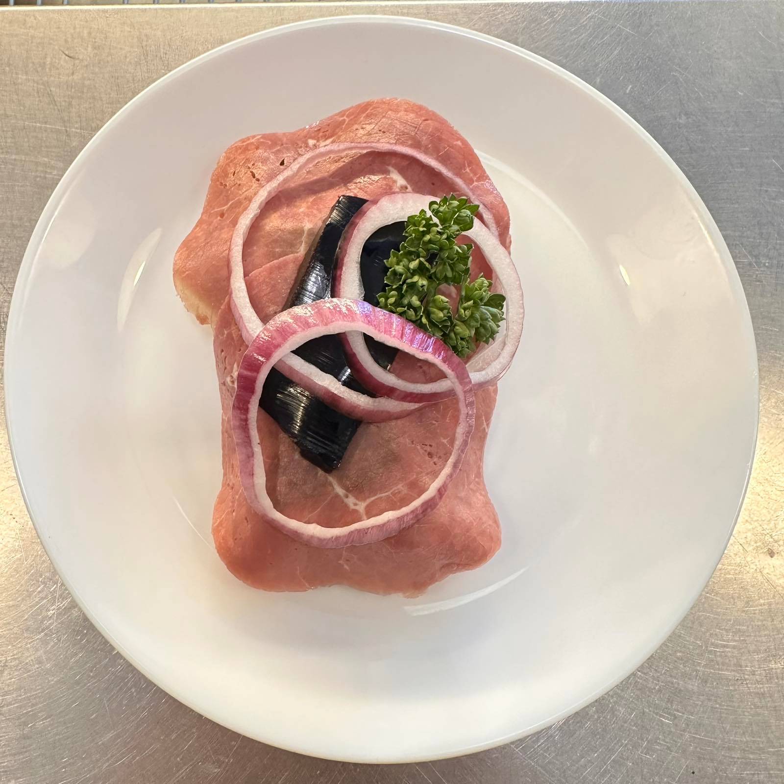 Traditionell fläskrullad serverad på mörkt rågbröd med smakrik sky och färsk rödlök. En rustik och genuin dansk smakupplevelse. Meddela allergier vid beställning.