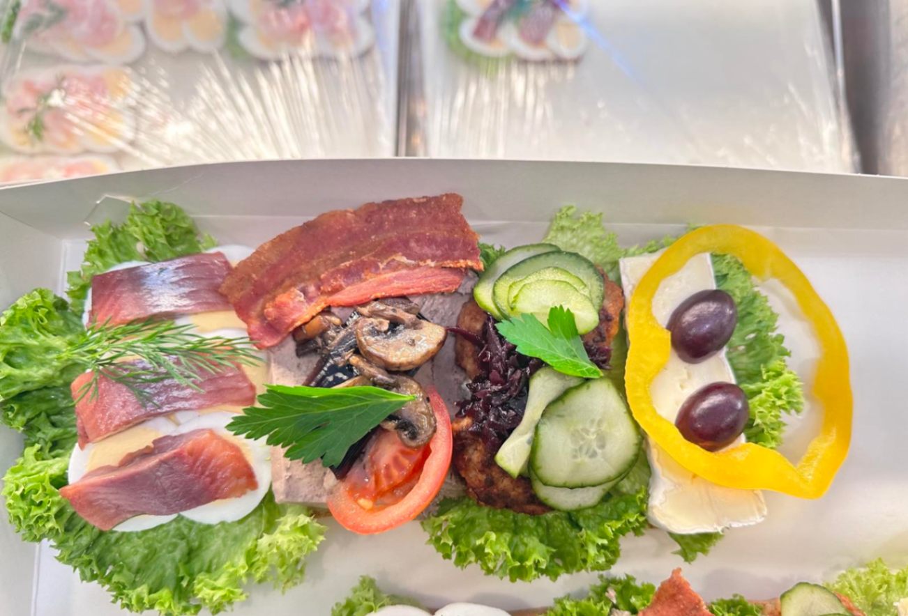 Generös landgång med äggsallad och räkor, klassisk dansk fläskstek med inlagd gurka och rödkål, samt grillad kyckling med currymajonnäs och bacon. Avslutas med brieost, vindruvor och paprika. Kan anpassas efter önskemål; meddela allergier vid beställning.