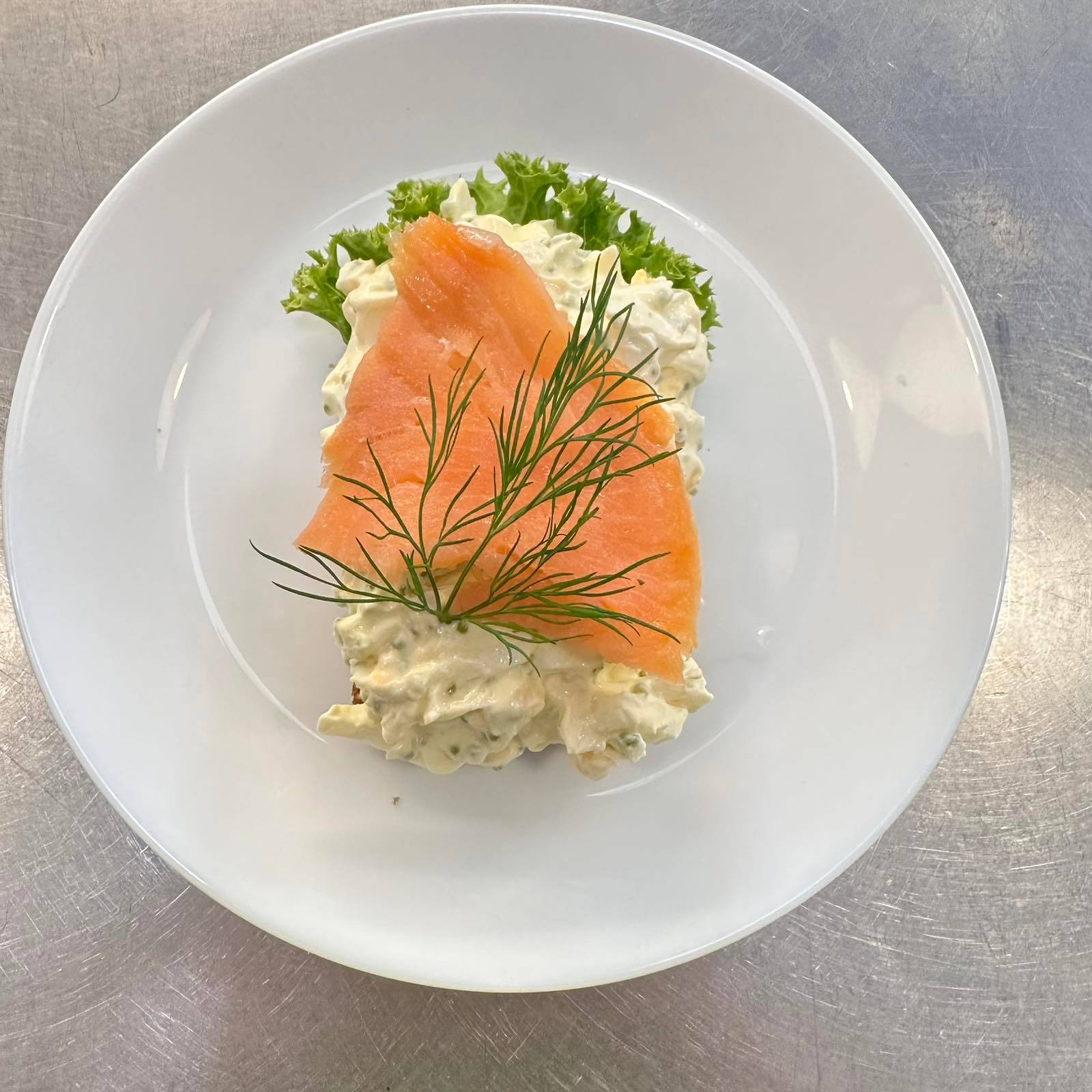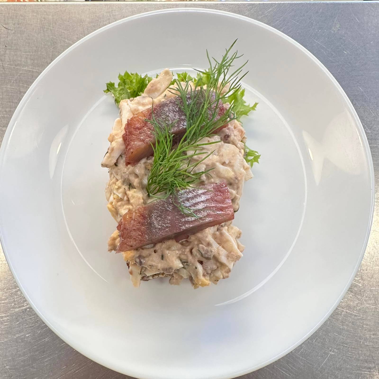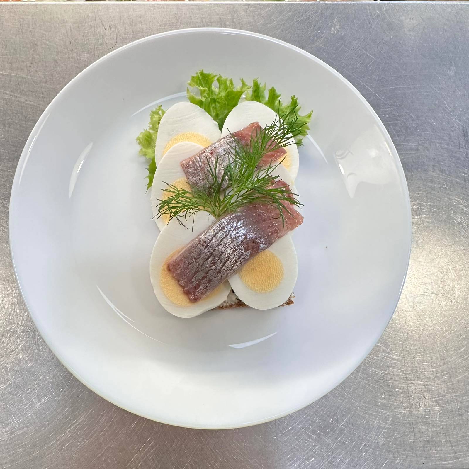 Klassisk håndmad på mörkt surdegsbröd med fullkorn och linfrö. Serveras med smakrik kryddsill, kokt ägg och krämig majonnäs på en bädd av krispig sallad, toppad med färsk dill. Kan anpassas efter önskemål; meddela allergier vid beställning.