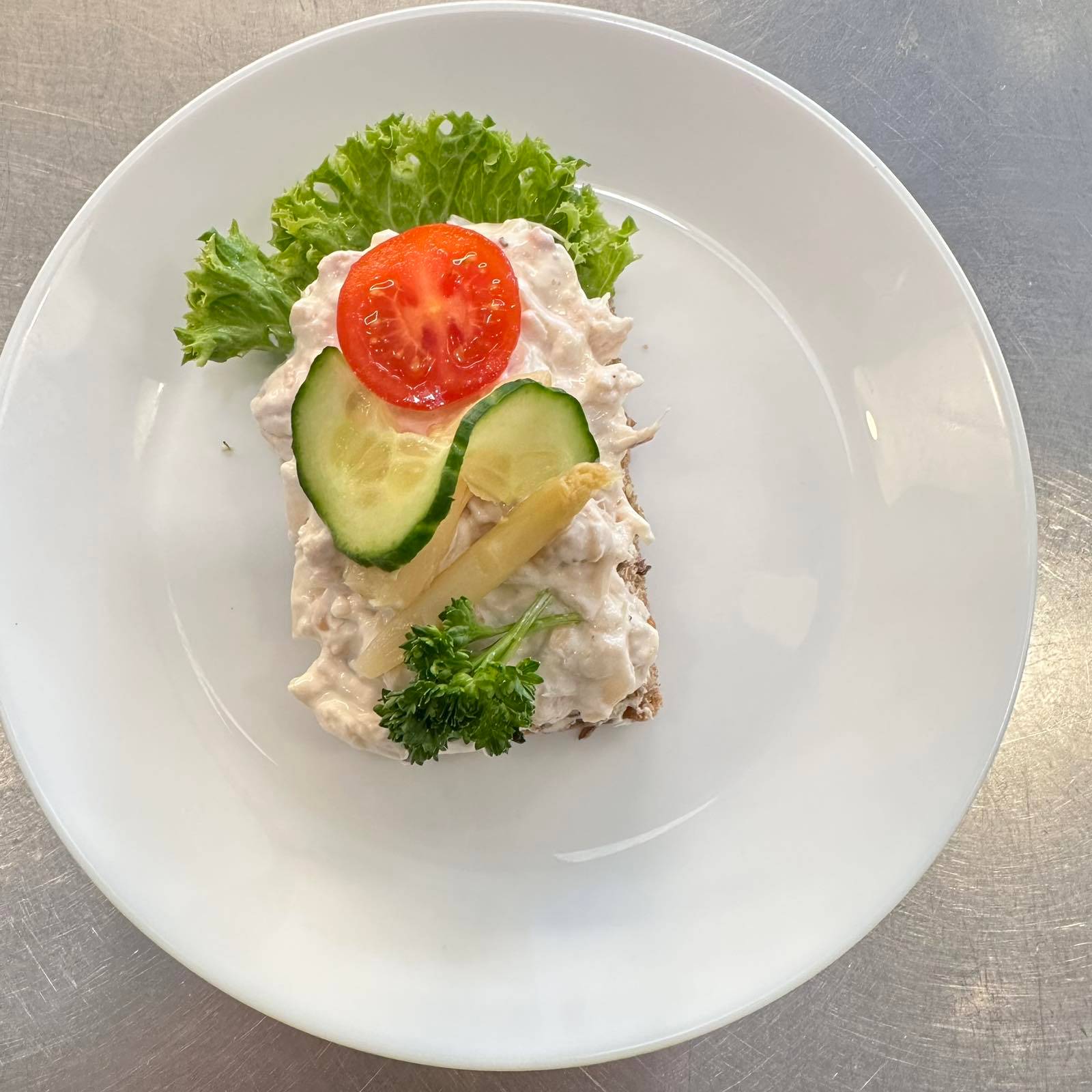 En krämig och klassisk dansk hönsesallad serverad på mörkt rågbröd. Toppas med vit sparris, knaperstekt bacon, tomat och färsk persilja för en lyxig smakupplevelse. Meddela allergier vid beställning.