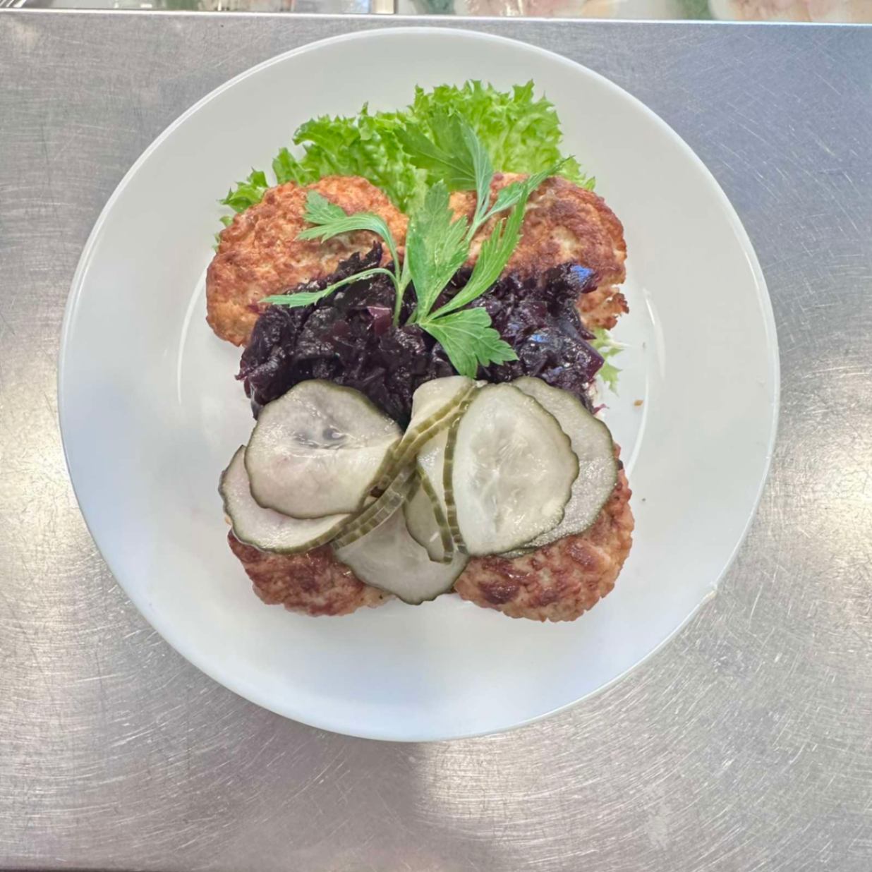 Danska frikadeller med rödkål & gurka (Stor) – Dansk Smørrebröd