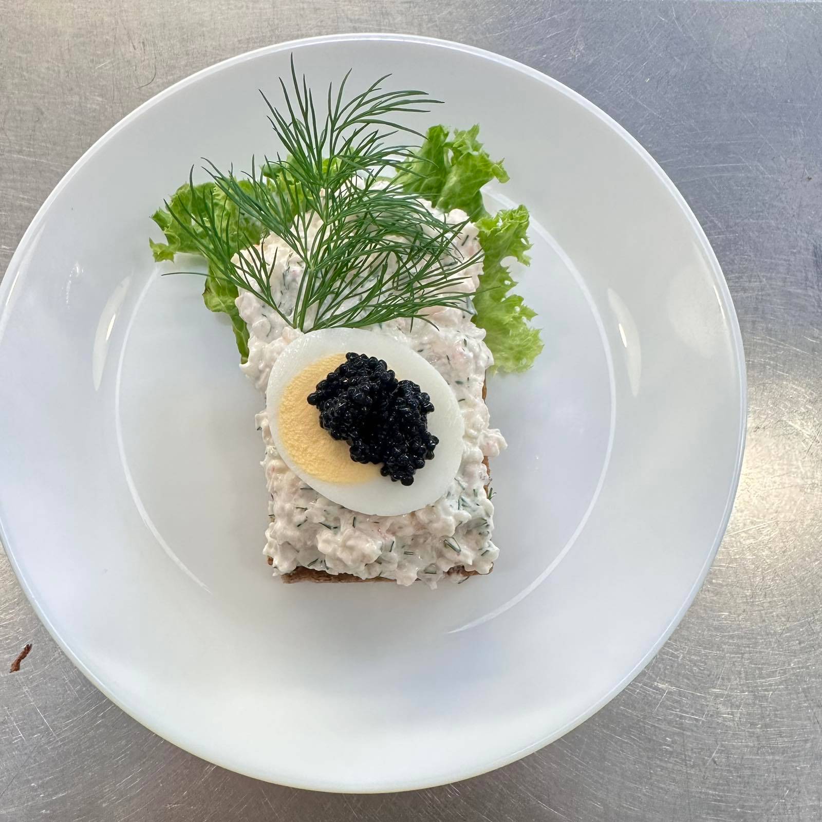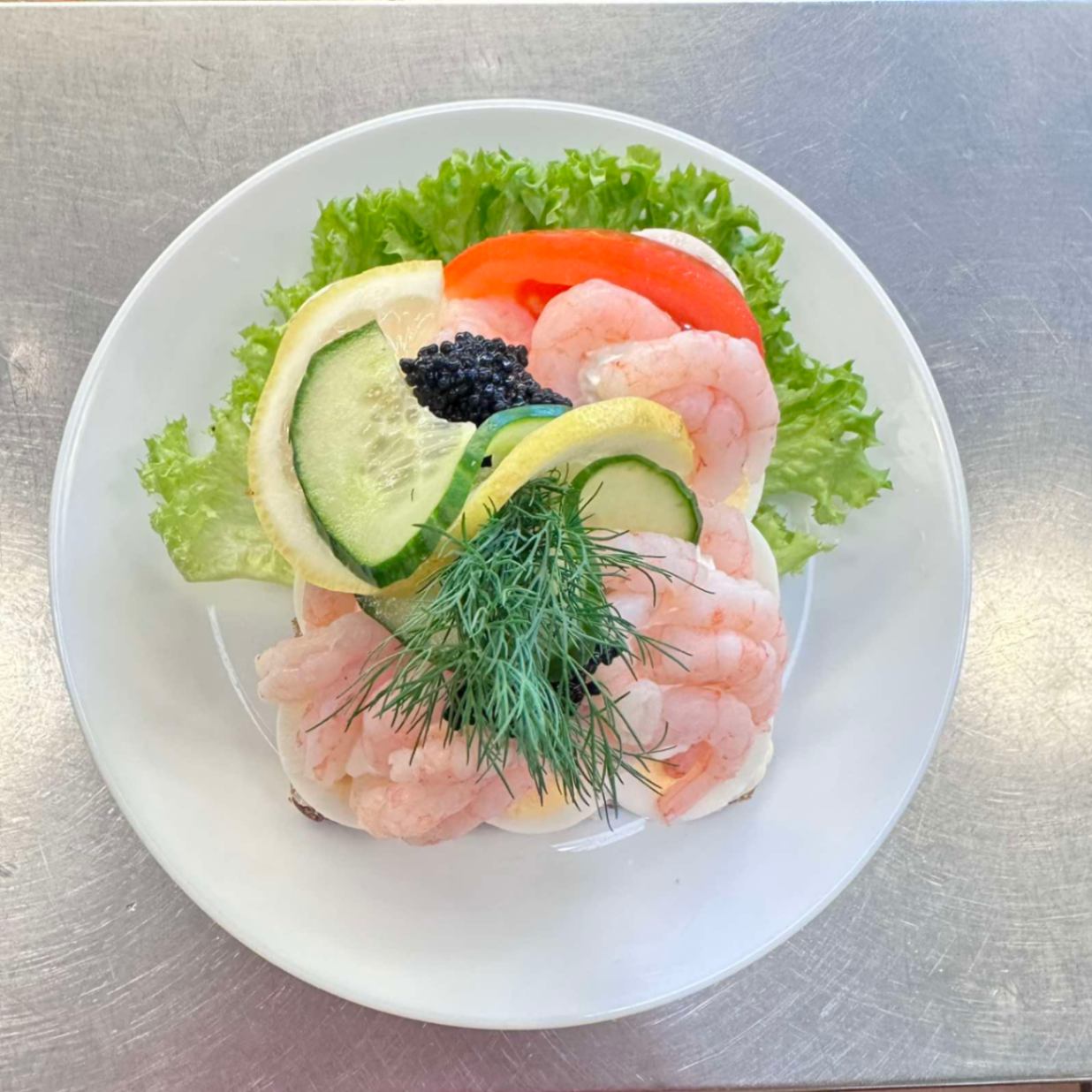 En lyxig dansk klassiker med vår smakrika hemgjorda skagenröra. Toppas med fin kaviar, citron och färsk dill för en frisk havssmak. Meddela allergier vid beställning.