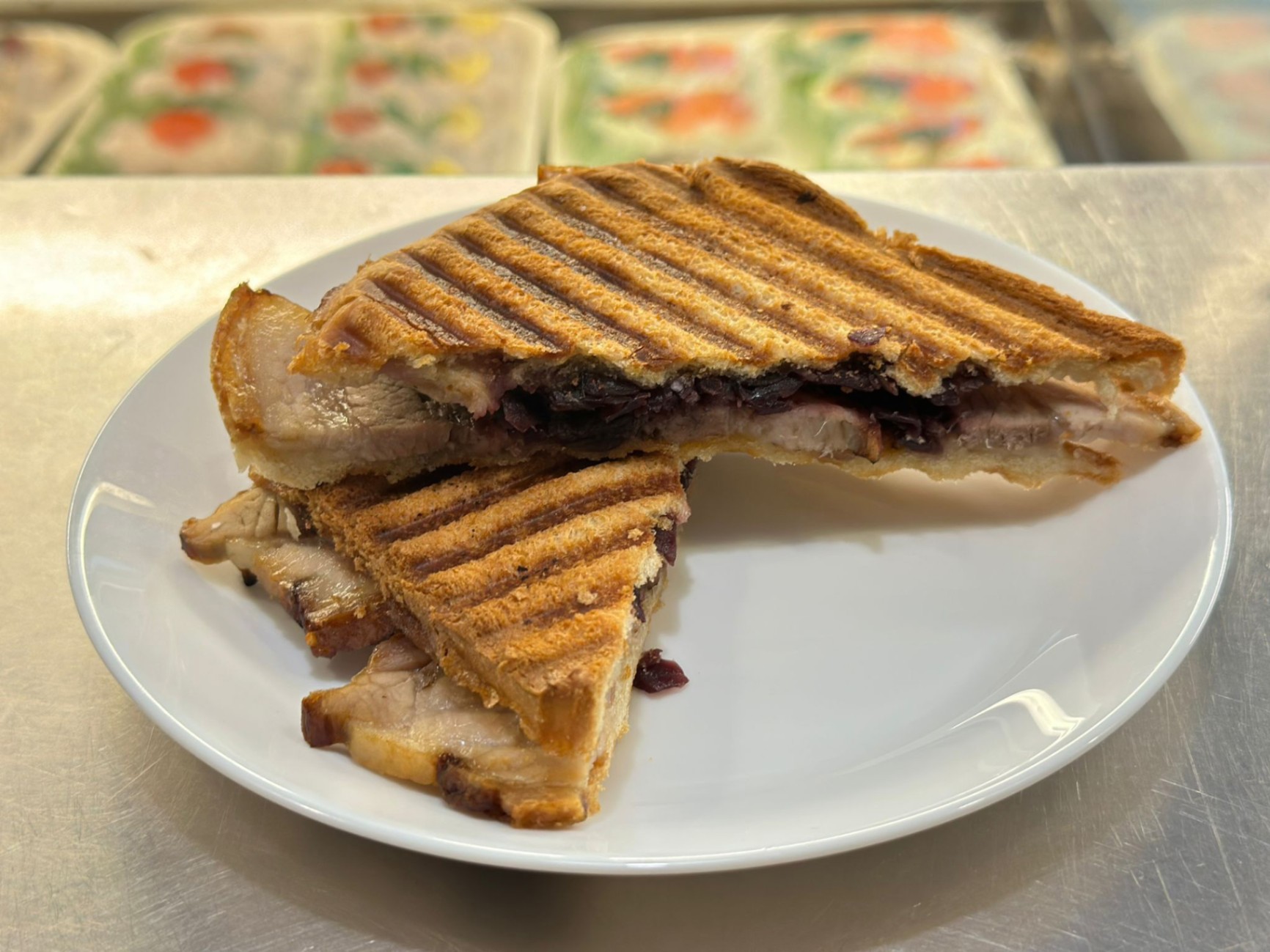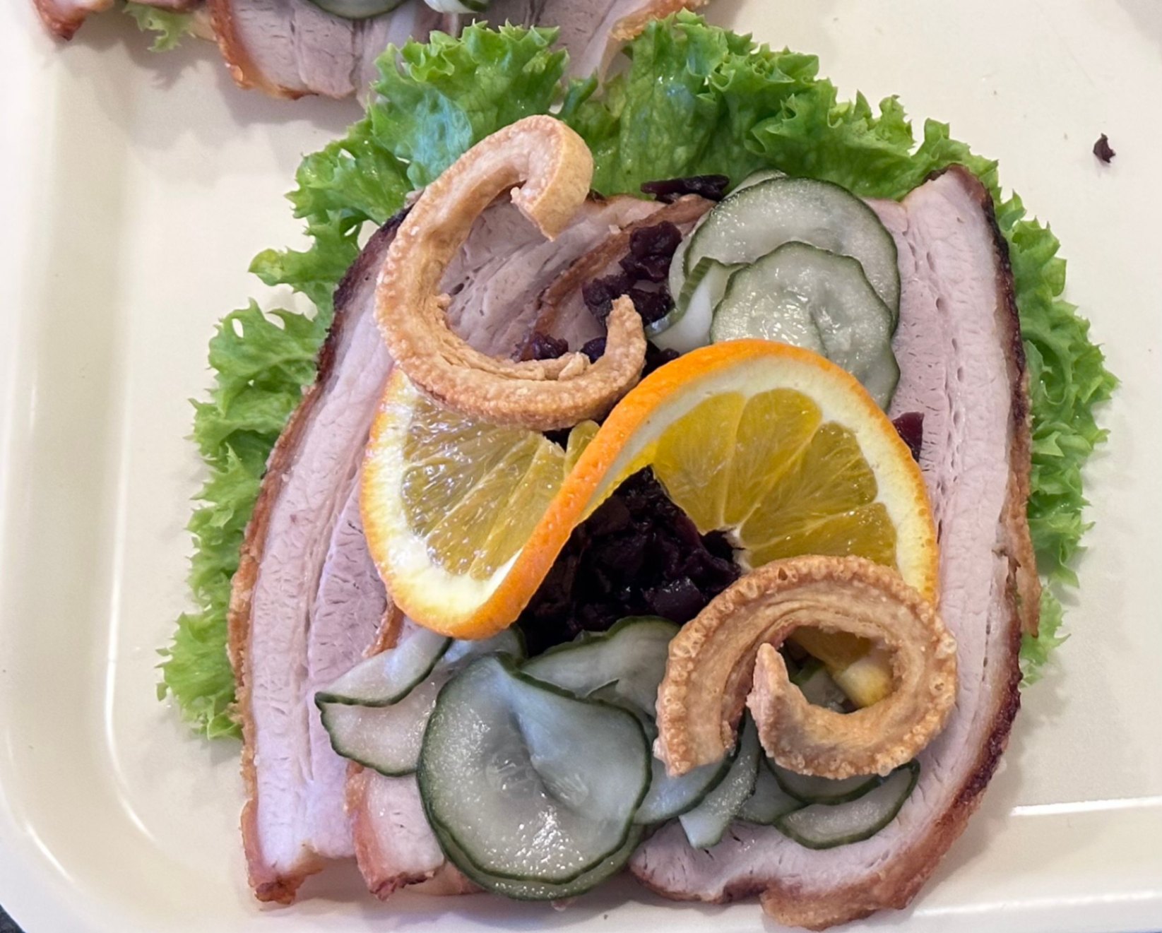 Nystekt dansk fläskstek med knaprig svål i generösa skivor på en stor skiva mörkt rågbröd. Serveras med klassiska tillbehör som sötstekt rödkål och inlagd gurka. Meddela allergier vid beställning.