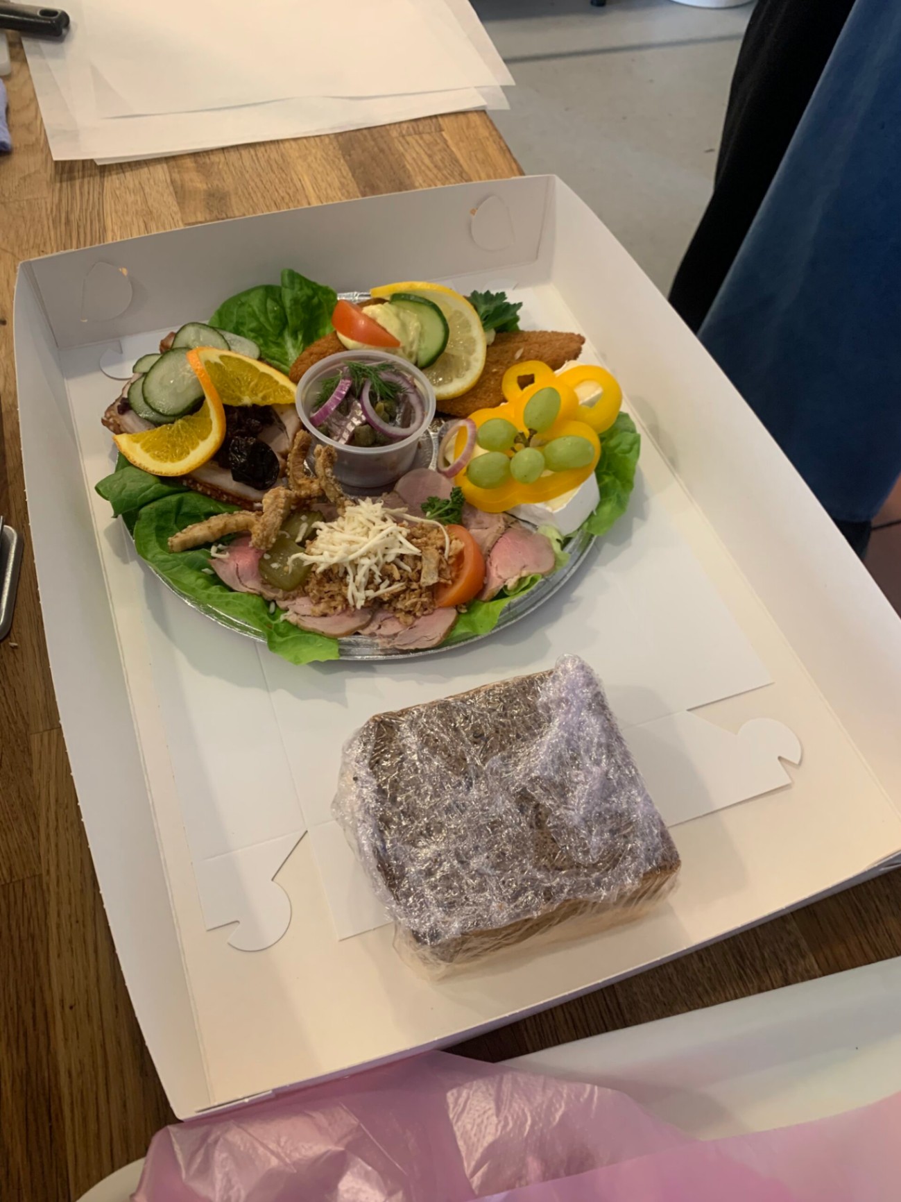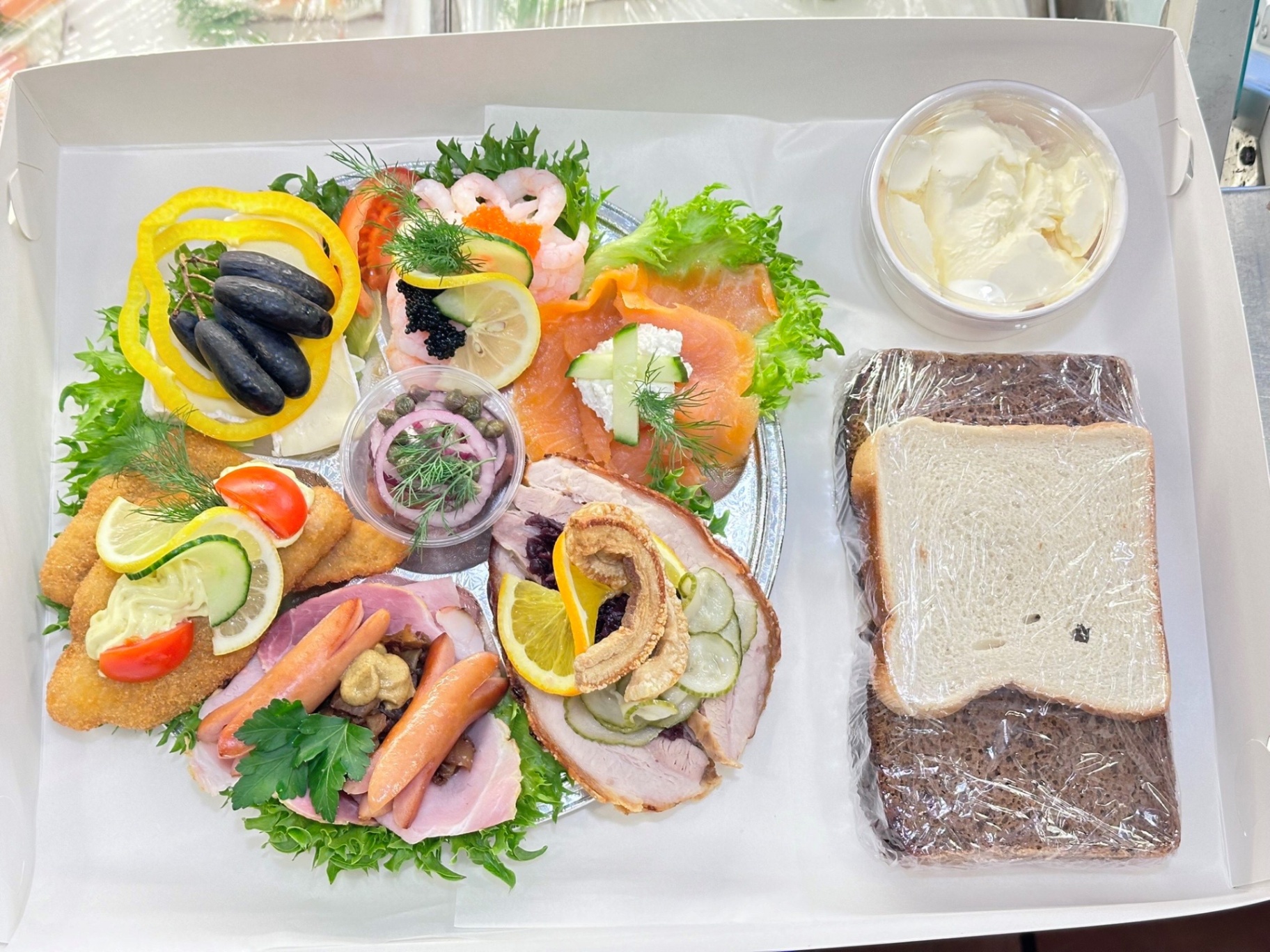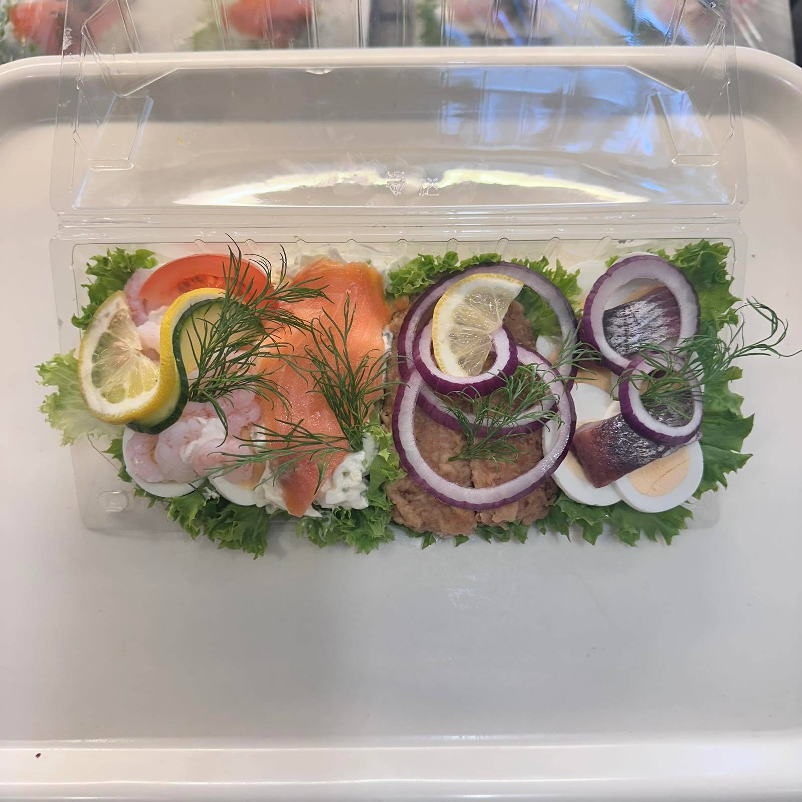 Ett smakfullt fat fyllt med danska favoriter. Innehåller löksill, sprödbakad rödspätta med remoulad, hemmagjorda frikadeller med potatissallad och dansk fläskstek med rödkål. Avslutas med krämig brieost, vindruvor och paprika. Bröd och smör ingår. Meddela allergier vid beställning.