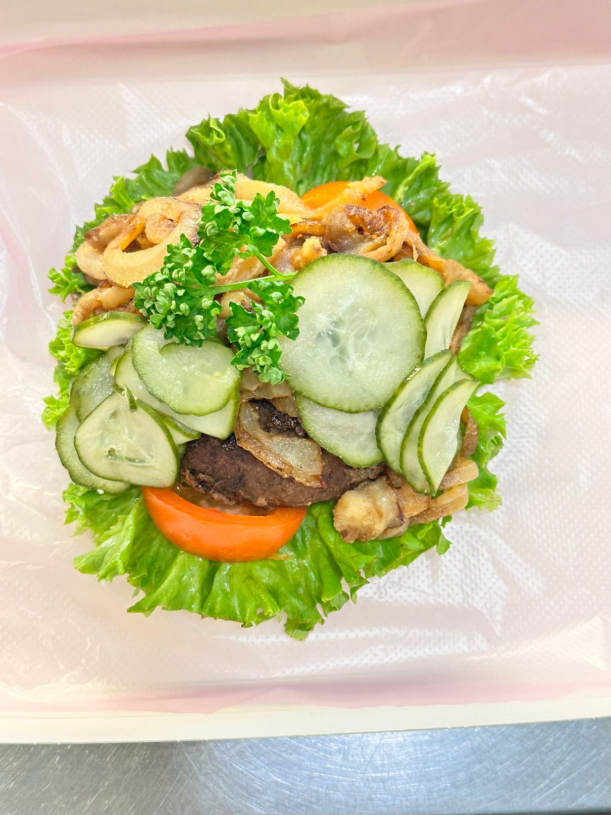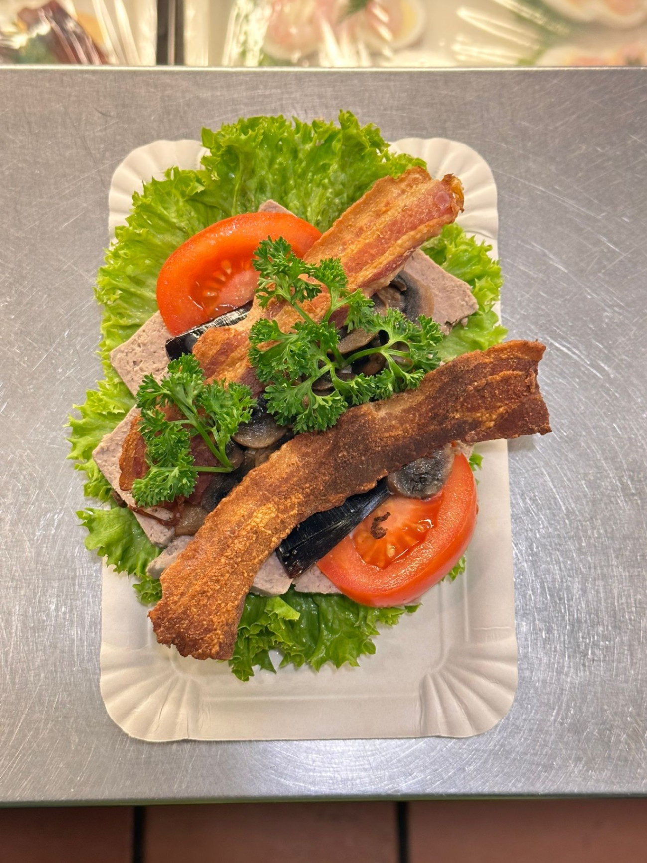 Klassisk stor håndmad på mörkt surdegsbröd med fullkorn och linfrö. Serveras med krämig leverpastej på en bädd av krispig sallad, toppad med smörstekta champinjoner, knaperstekt bacon och inlagd gurka. Kan anpassas efter önskemål; meddela allergier vid beställning.
