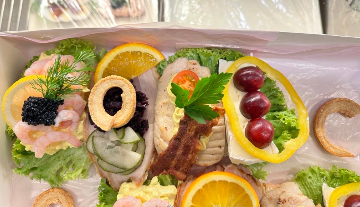 Smakrik landgång med äggsallad i currysmak och räkor, fläskrulad med sky, samt rostbiff med remoulad, rostad lök och saltgurka. Toppas med brieost, vindruvor och paprika. Kan anpassas efter önskemål; meddela allergier vid beställning.