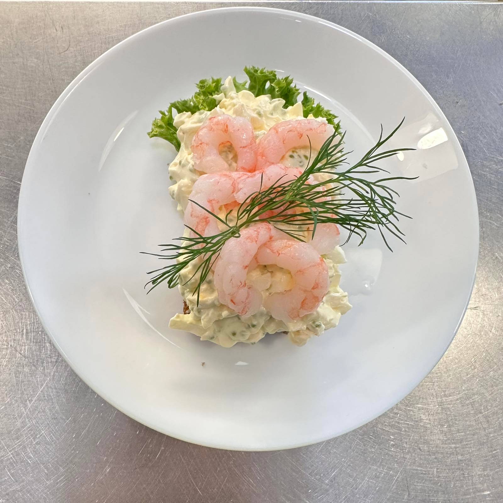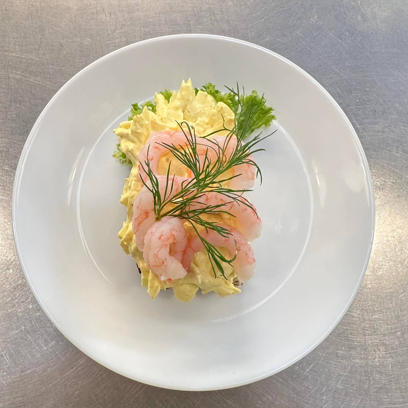 En krämig äggsallad med en touch av curry på mörkt rågbröd, rikligt toppad med handskalade räkor. Garneras med färsk dill för en klassisk och fyllig smakupplevelse. Meddela allergier vid beställning.