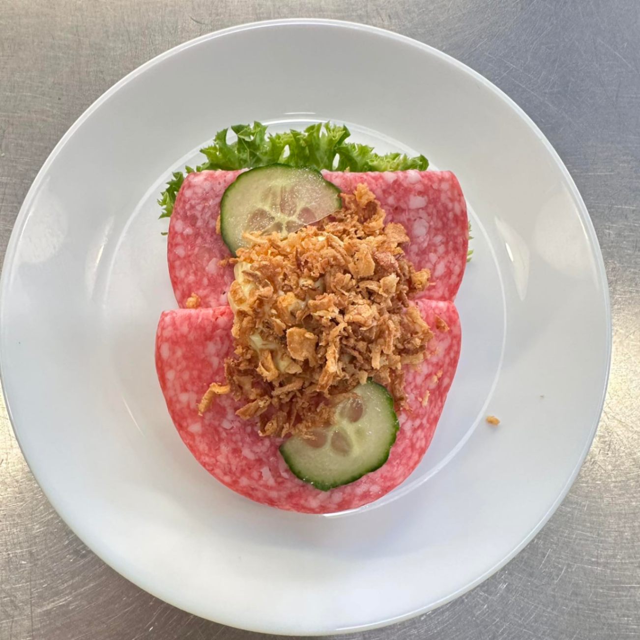 Dansk salami på mörkt rågbröd som serveras med klassisk dansk remoulad och krispig rostad lök. En smakrik favorit med härlig textur. Meddela allergier vid beställning.