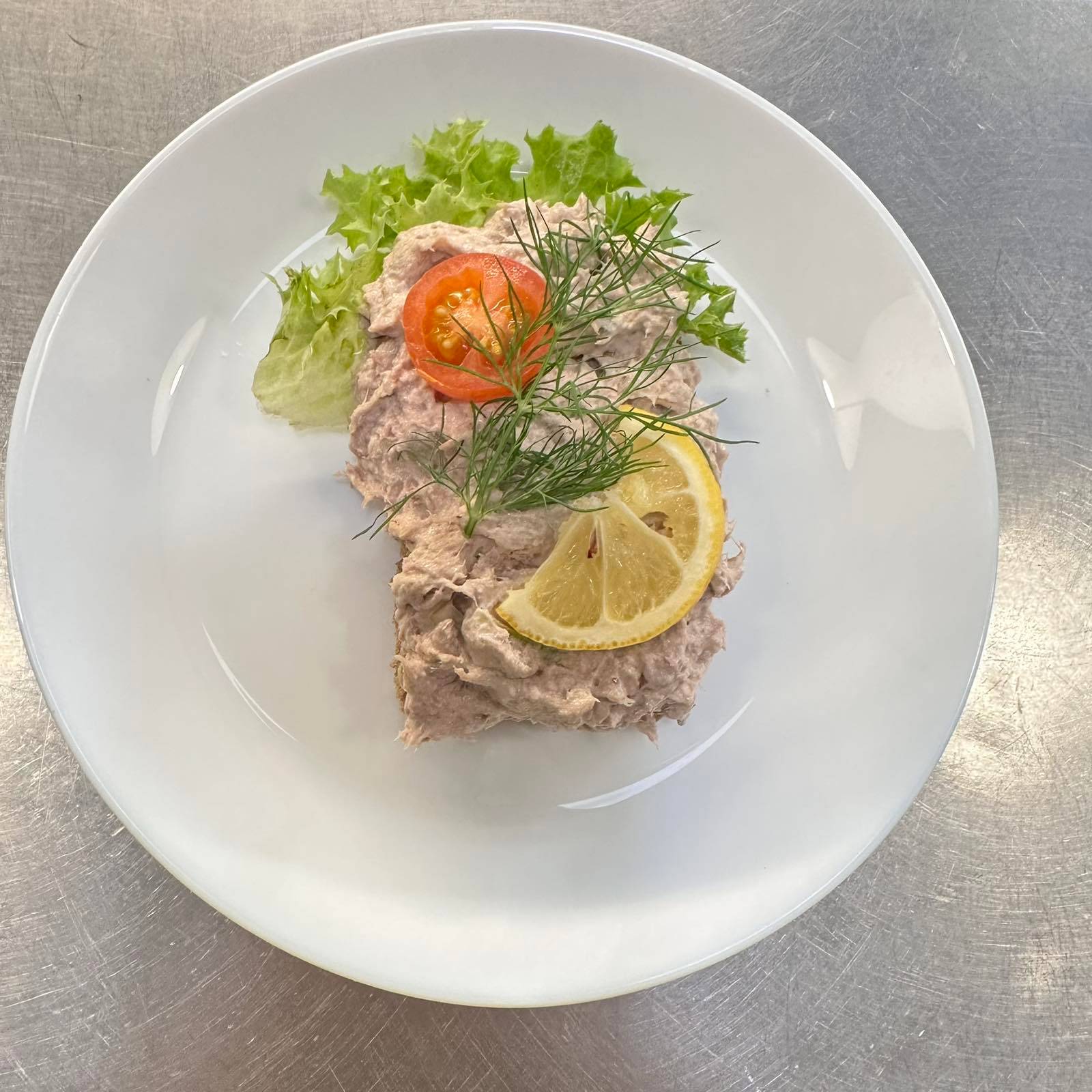 En krämig och smakrik tonfisksallad med finhackad purjolök på en botten av mörkt rågbröd. Toppas med citron, färsk dill och tomat för en frisk och balanserad smak. Meddela allergier vid beställning.