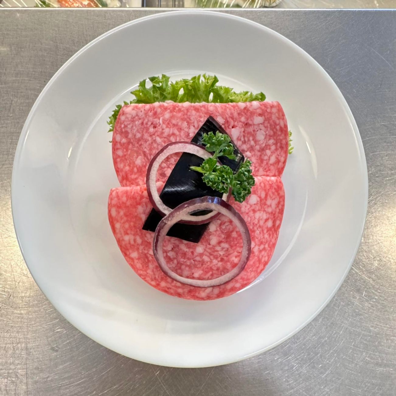 Traditionell dansk salami på mörkt rågbröd, garnerad med smakrik sky och färsk rålök. En rustik och genuin smakupplevelse. Meddela allergier vid beställning.