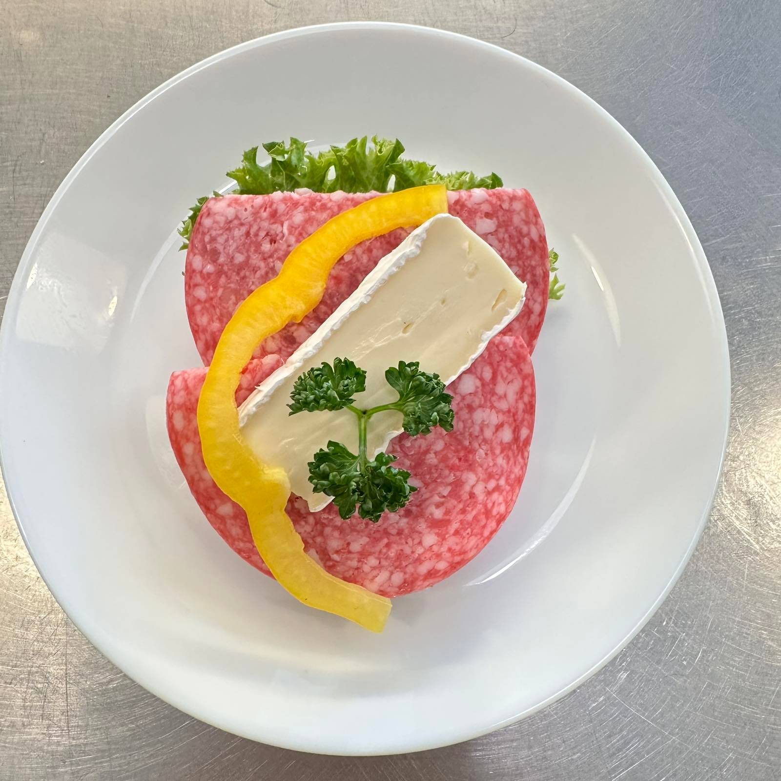 En smakrik kombination av dansk salami och krämig fransk lantbrie på mörkt rågbröd. Toppas med krispig paprika, fräsch sallad och persilja. Meddela allergier vid beställning.