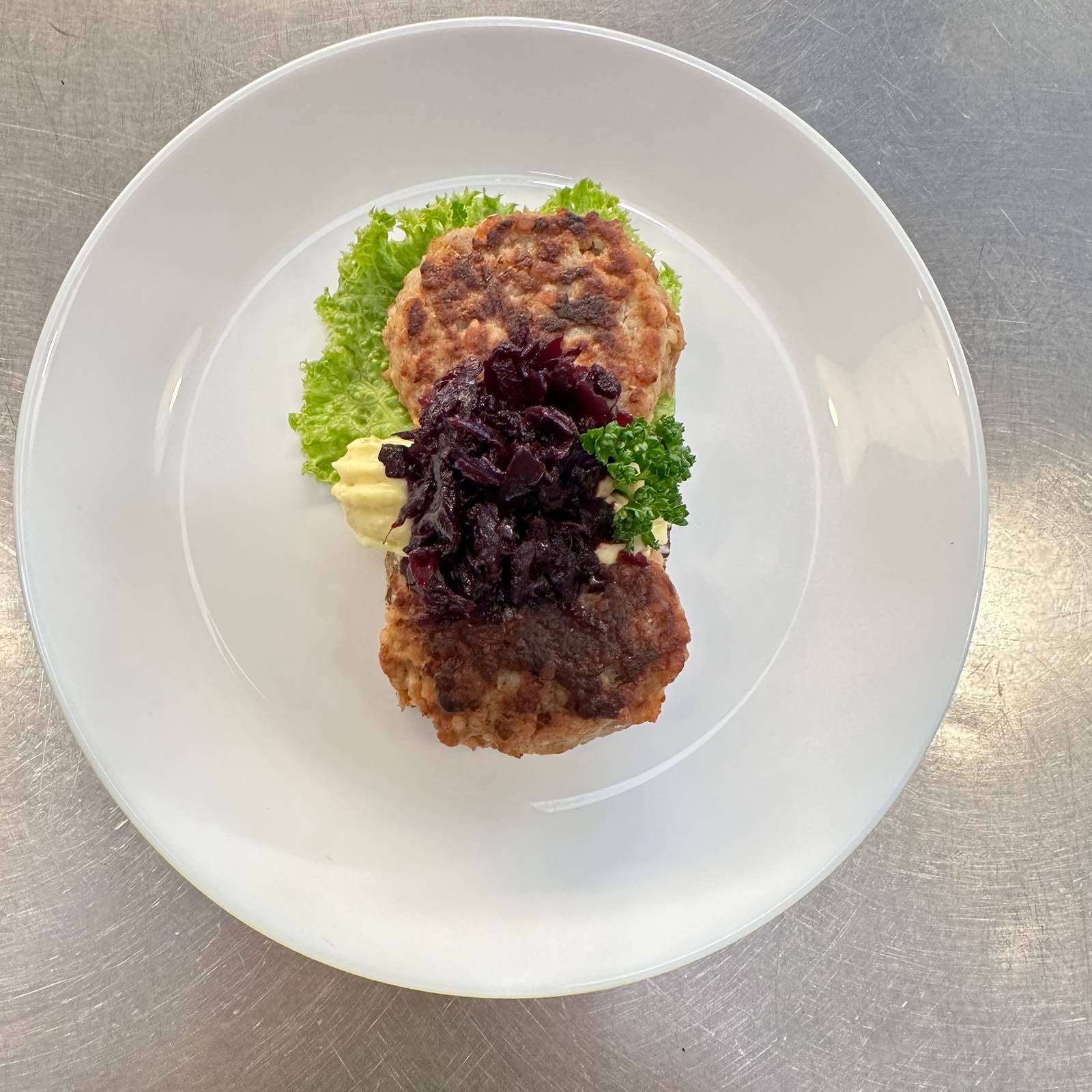 Rejäla danska frikadeller i storformat på en botten av mörkt rågbröd. Serveras traditionsenligt med sötstekt rödkål och krispig inlagd gurka för en mättande och genuin smakupplevelse. Meddela allergier vid beställning.