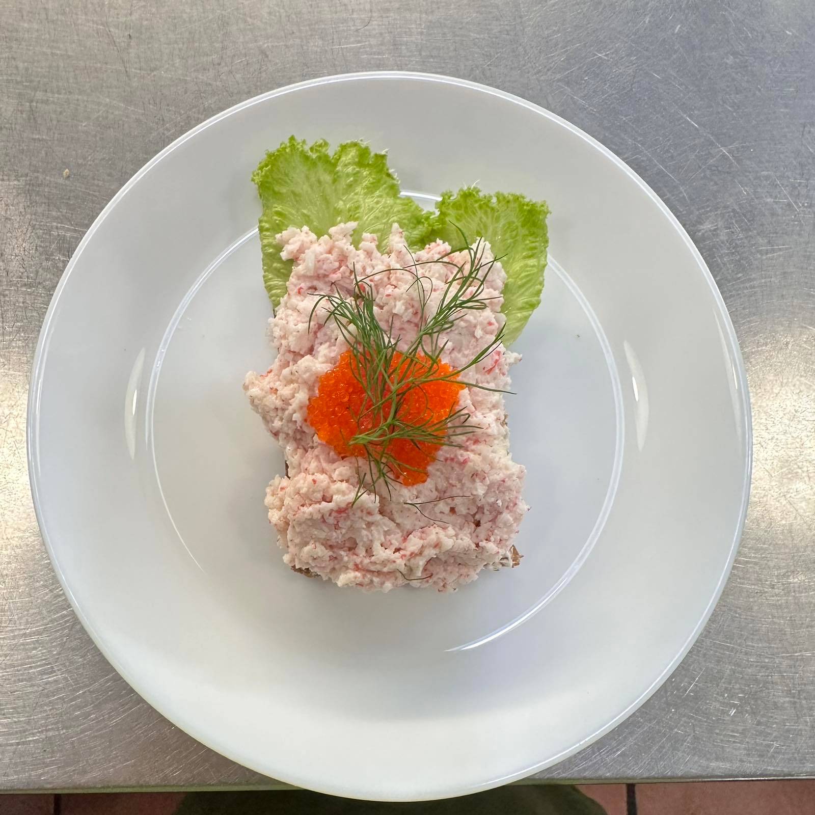 En krämig och smakrik krabbsallad på en botten av mörkt rågbröd. Toppas traditionsenligt med röd kaviar och färsk dill för en festlig och lyxig känsla. Meddela allergier vid beställning.
